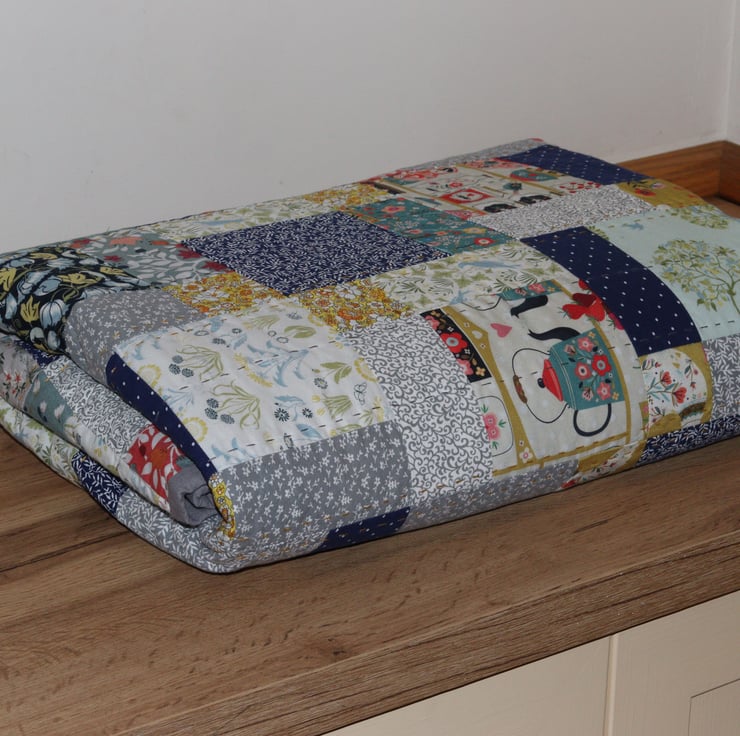 Shades of teal, grey, blue and yellow come together in this traditionally made patchwork quilt or throw. The quilt measures 160cm x 190cm (63 x 75 inches) and is made using 100% cotton fabric and thread. The inner layer, or wadding, is 50% cotton, 50% bamboo, providing a very soft and breathable layer of warmth.