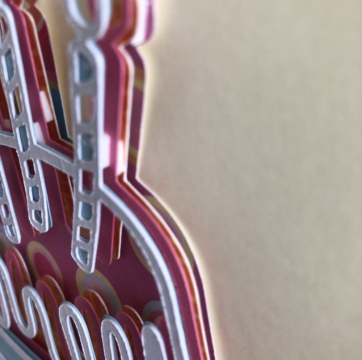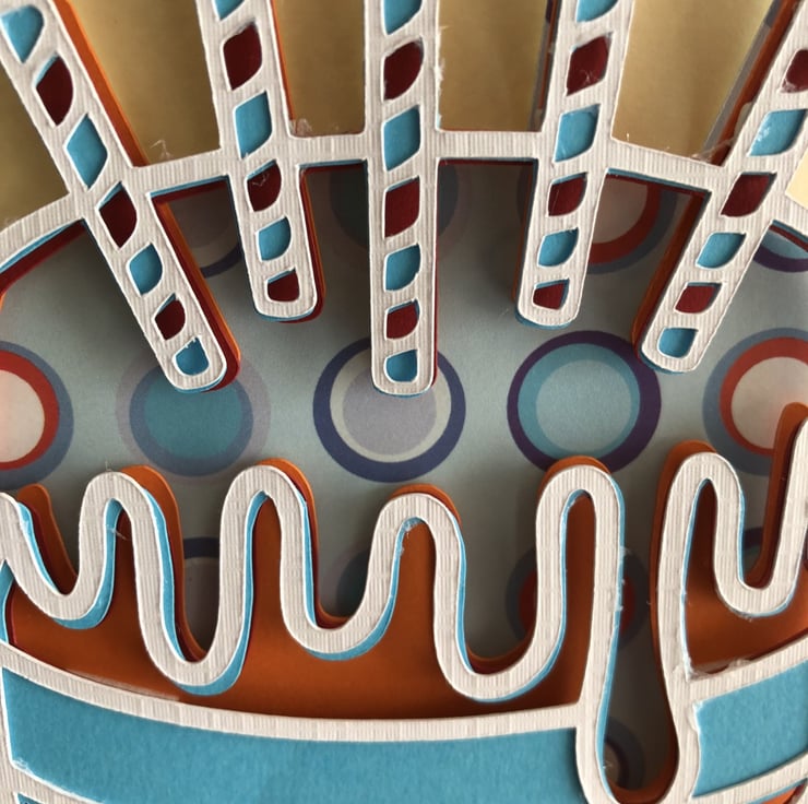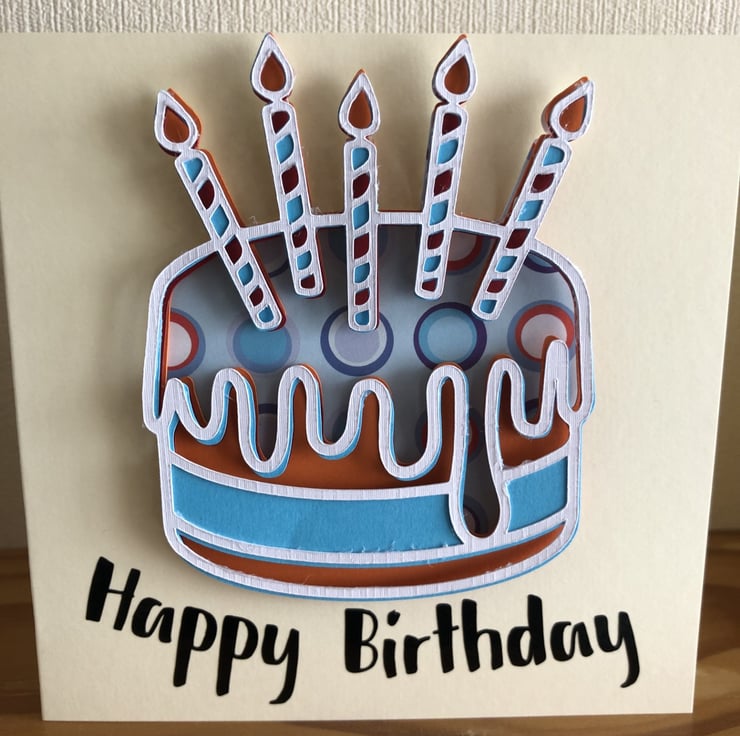 Card decorated birthday card. The birthday cake is layered in different colours and set on foam pads to create a 3D effect.