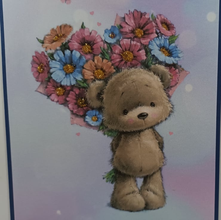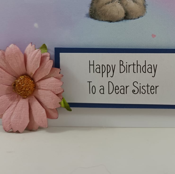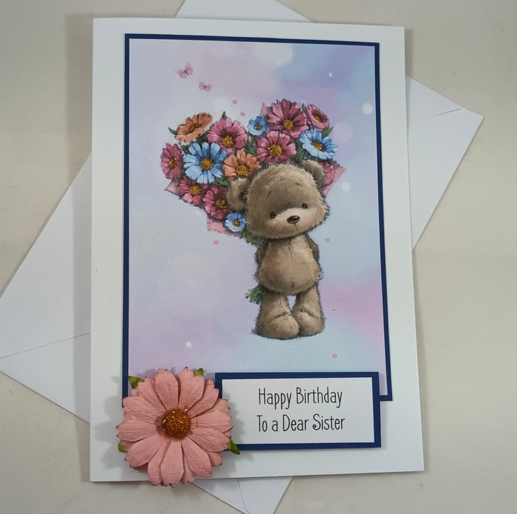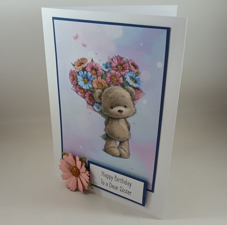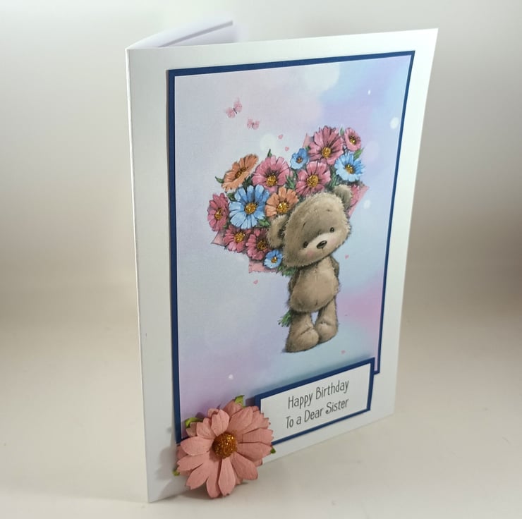 Birthday card for a sister featuring a printed image of a cute bear holding a bouquet of flowers. The centres of the flowers have been glittered. The image and sentiment 'Happy Birthday To a Dear Sister' have been mounted on dark blue card and embellished with a pink paper flower, the centre of which has also been glittered.