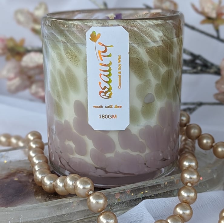 The "Beauty" candle is not only a sensorial delight but also a visual masterpiece. Housed in a stunning soft pink and gold design glass container with chic gold foiled label. Radiating elegance and charm, making it a stylish addition to any space. Each candle contains 180gms of high-quality coconut and soy wax, ensuring a clean and long-lasting burn. We take pride in our commitment to purity and ethics – our candles are paraben-free, cruelty-free, and completely vegan.