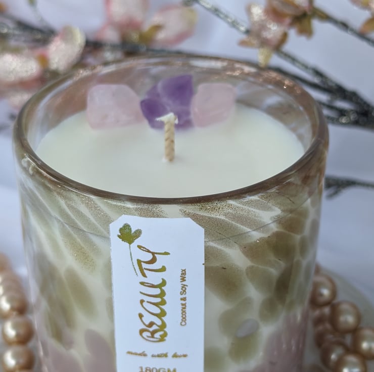 Indulge in the exotic and harmonious blend of fragrances that define our "Beauty" candle fragranced with Rosewood and Coconut Cream. With sheer white florals and creamy coconut milk, this unique blend is complimented with clove bud, cinnamon bark, vanilla bean and light musk. This beautiful candle is also adorned with Rose quartz, thought to encourage self-love and acceptance. Using this crystal may help boost self-esteem, foster a positive self-image, and encourage self-care. and amethyst which is associated with calming and balancing properties. It is believed to help alleviate stress, anxiety, and negative emotions, promoting a sense of peace.