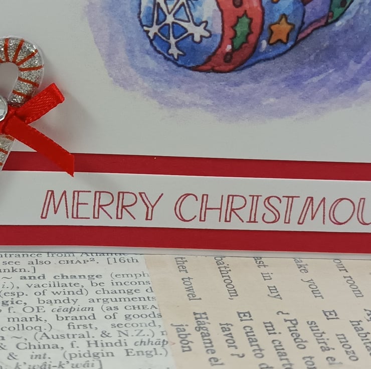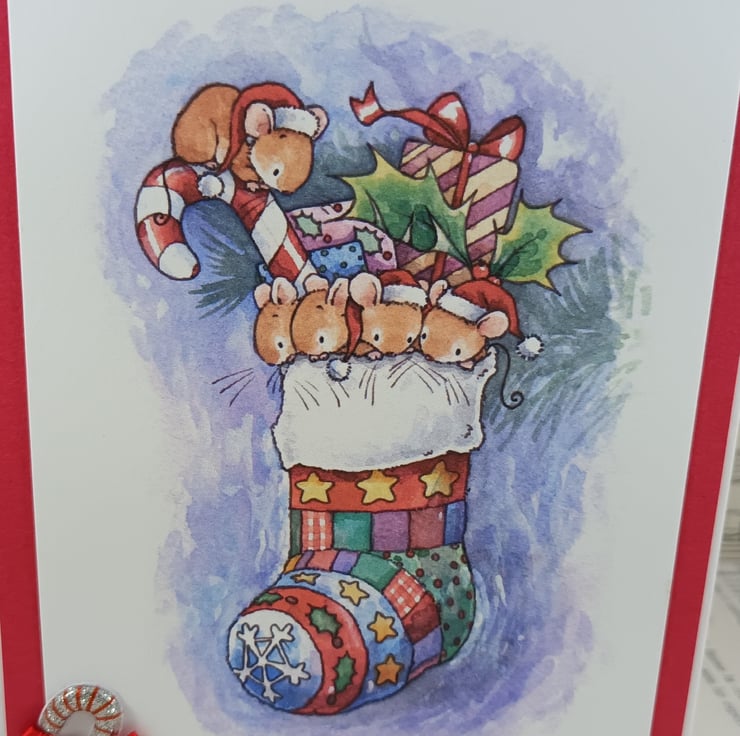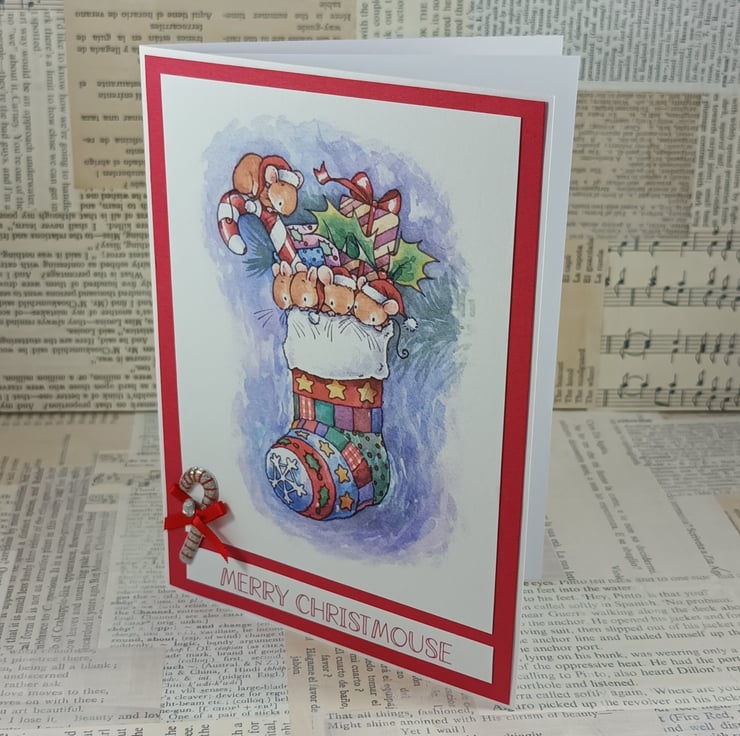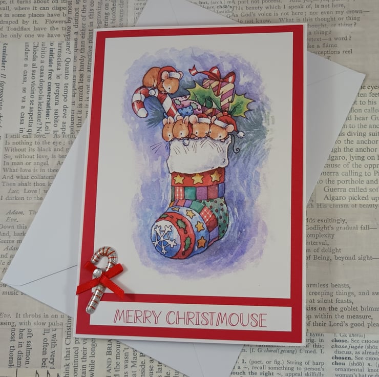 A6 Christmas card featuring a cute image of mice snuggled up in a Christmas stocking. The image has been overlaid onto red card, together with the sentiment 'Merry Christmouse' and has a small candy cane embellishment added.