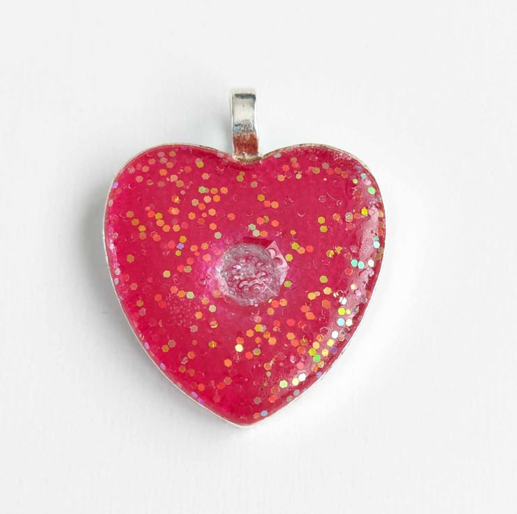 I have used an eco friendly epoxy resin, mixed with a pink tint and multicoloured glitter and cured it within a heart shaped bezel. I have placed a faux diamond upside down in the centre so you can feel the point protruding from the surface.