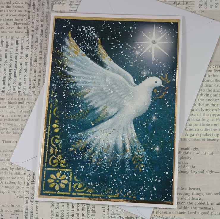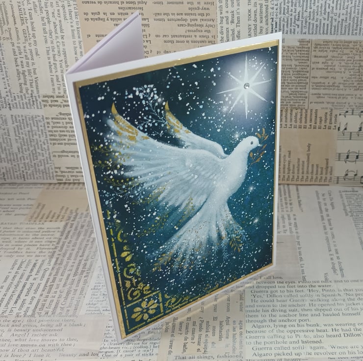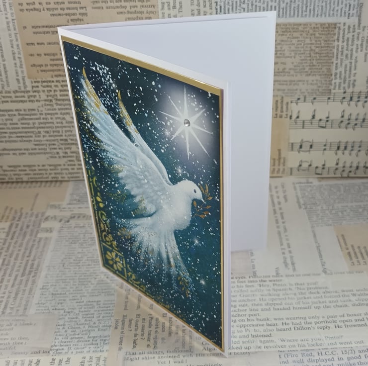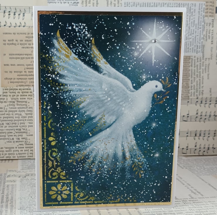 A6 Christmas card featuring a printed image of a dove with a branch in its beak with a bright star in the background. A small adhesive gem has been added to the centre of the star.. The image has been mounted onto gold mirri card.