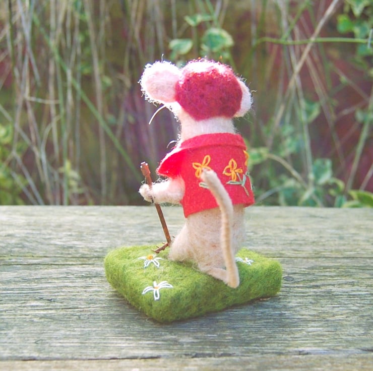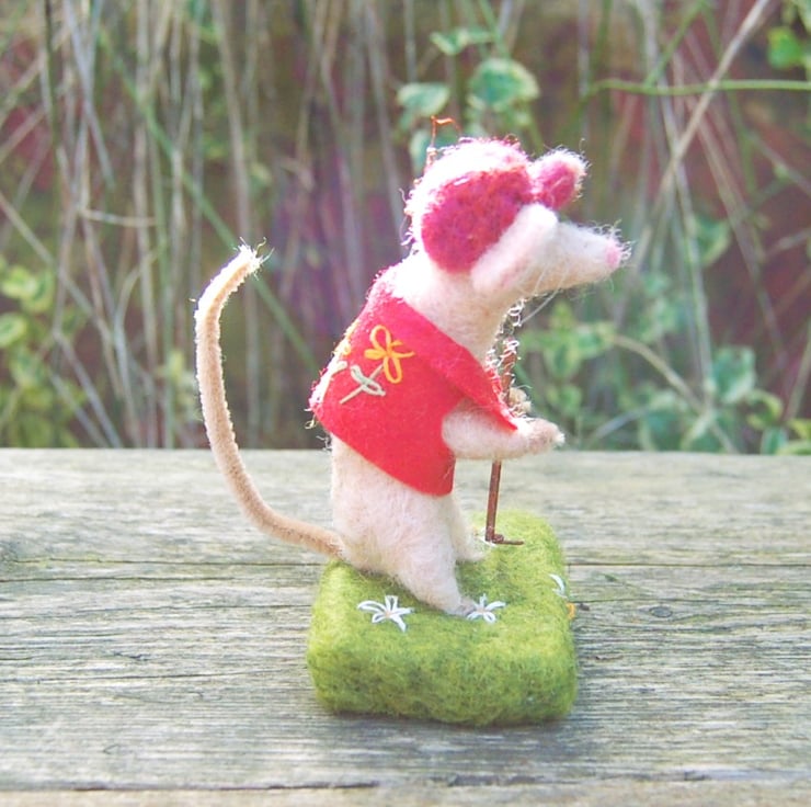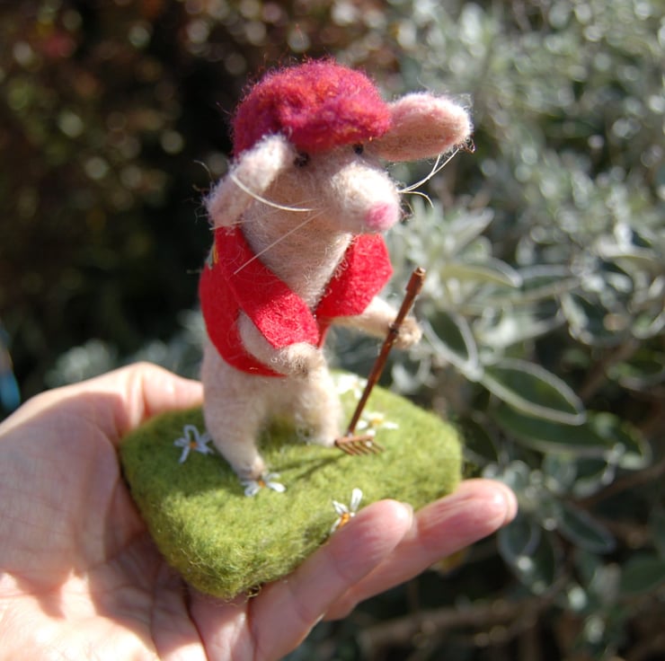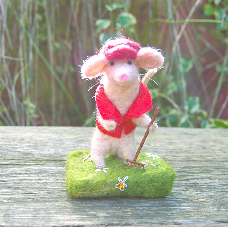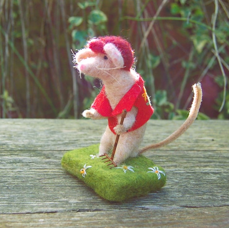 A cute gardening mouse holding a metal rake. Mouse is made from unspun wool fibres needlefelted into shape. The sandy coloured mouse is wearing a red cap and a red hand embroidered waistcoat. It is attached to a wool base covered in green wool fibres and decorated with hand embroidered white daisies.