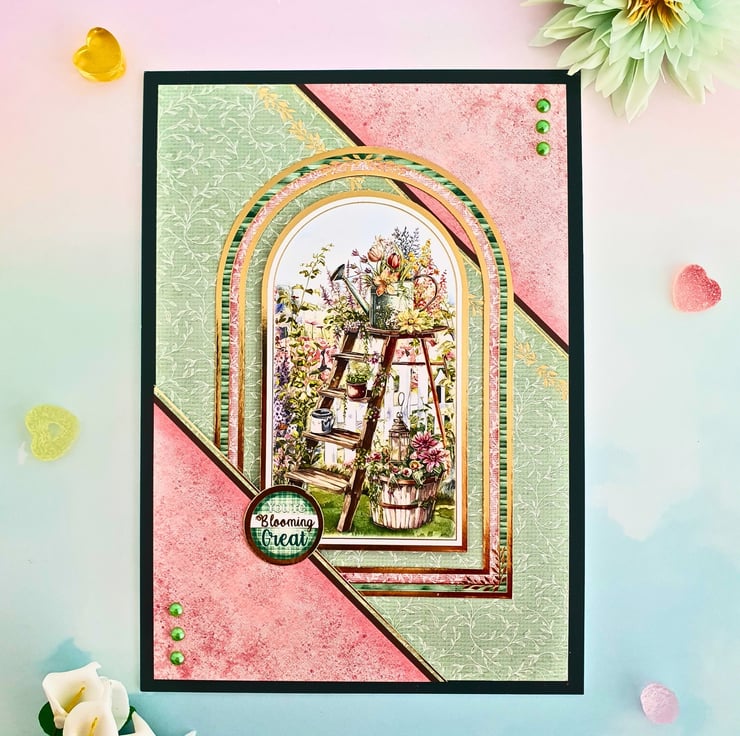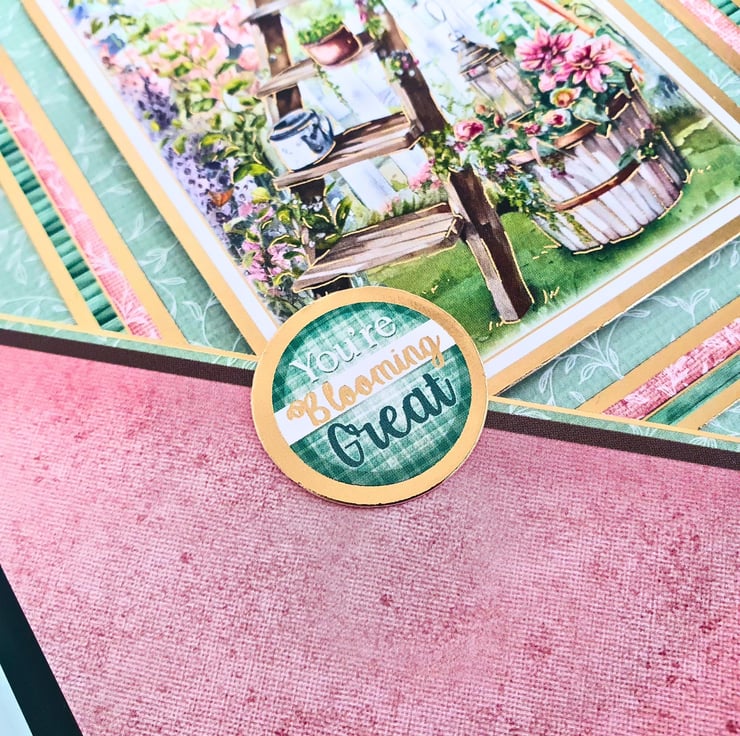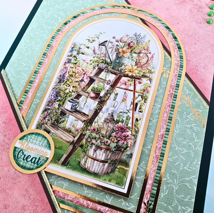 The card consists of mats of solid green card & floral printed cardstock with two diagonal panels, layered on the white card base. It is decorated with coordinating gold foiled toppers, and the button tag with the sentiment "You Are Blooming Great". It displays a floral image taken from a garden, with a wooden ladder, baskets & a watering can, all full of blooming spring flowers! It is embellished with green pearls.