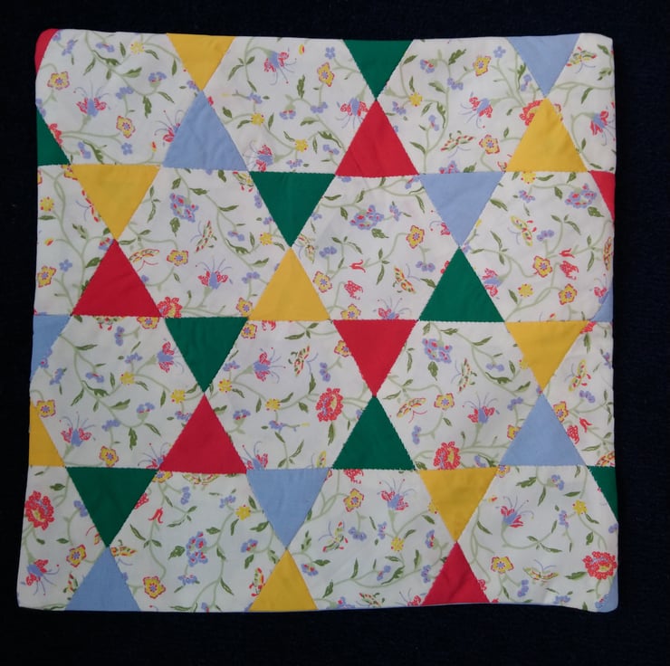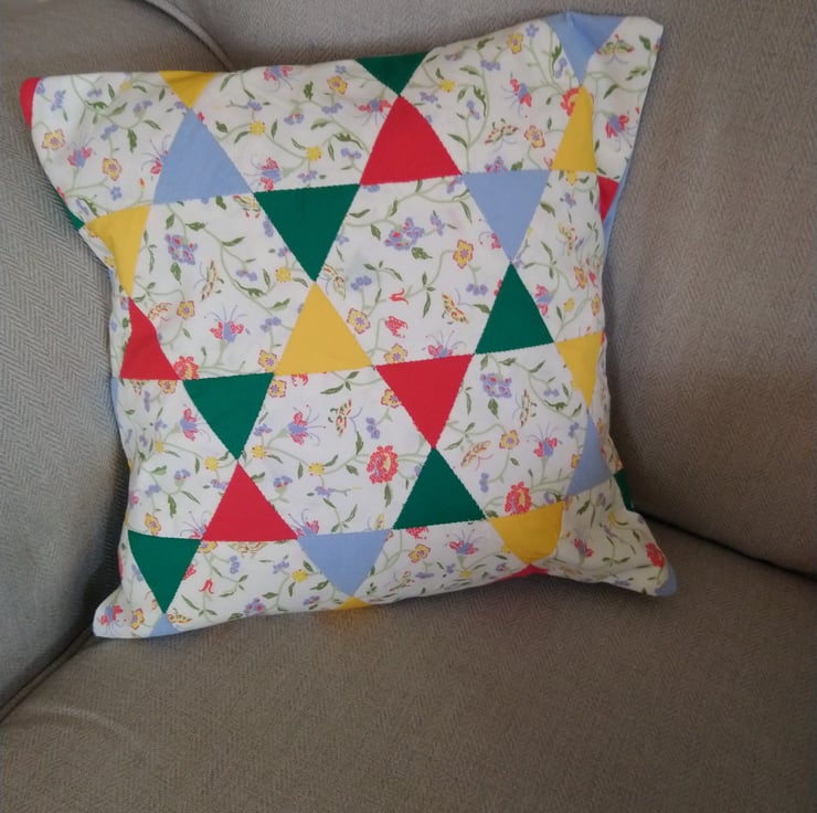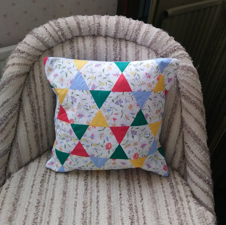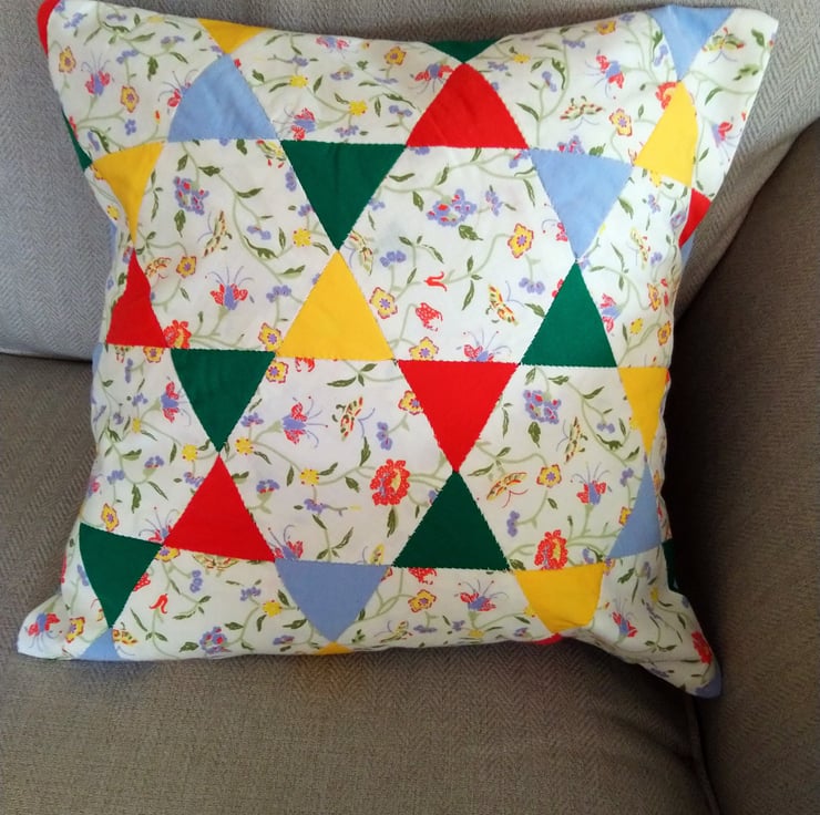 Patchwork cushion cover, traditionally handsewn with hexagons in Laura Ashley "Floribunda", along with triangles in bright primary coloured cotton- red, green, blue and yellow (not Laura Ashley) .