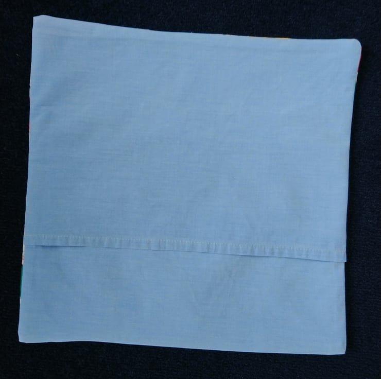 Fully lined in pale blue cotton so no raw edges. The reverse is in plain blue and features a wrapover opening for insertion of cushion pad (not included)