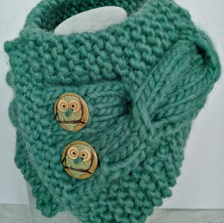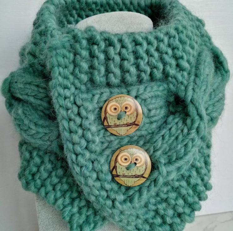 Silky soft and gloriously cosy cable knit neck warmer in Lakeside green with wided-eyed owl button closing.