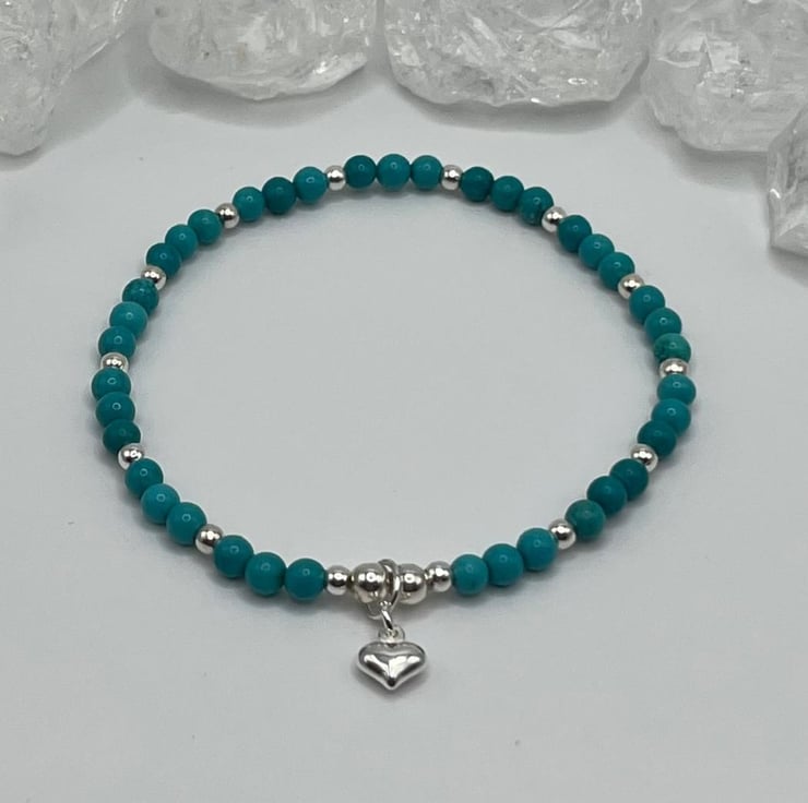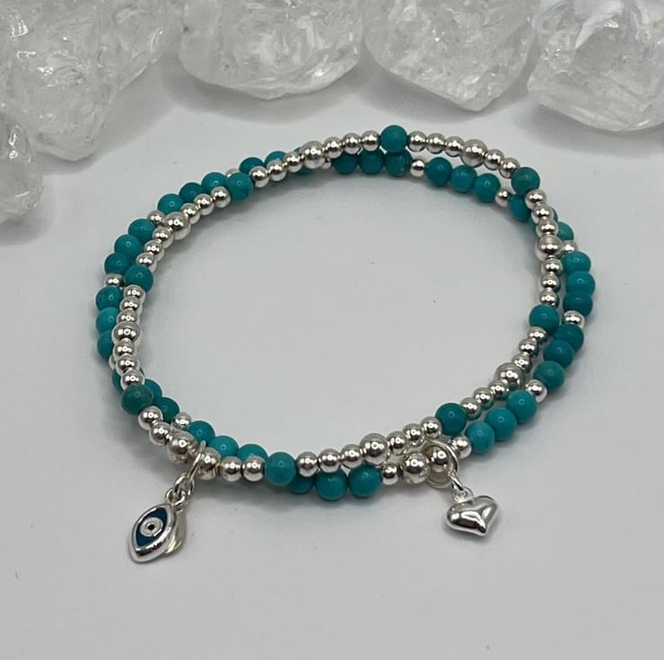 Hand made stack of two sterling silver and natural turquoise bracelets finished with a silver heart charm and eveil eye protection charm. Total width of bracelets is 4mm .