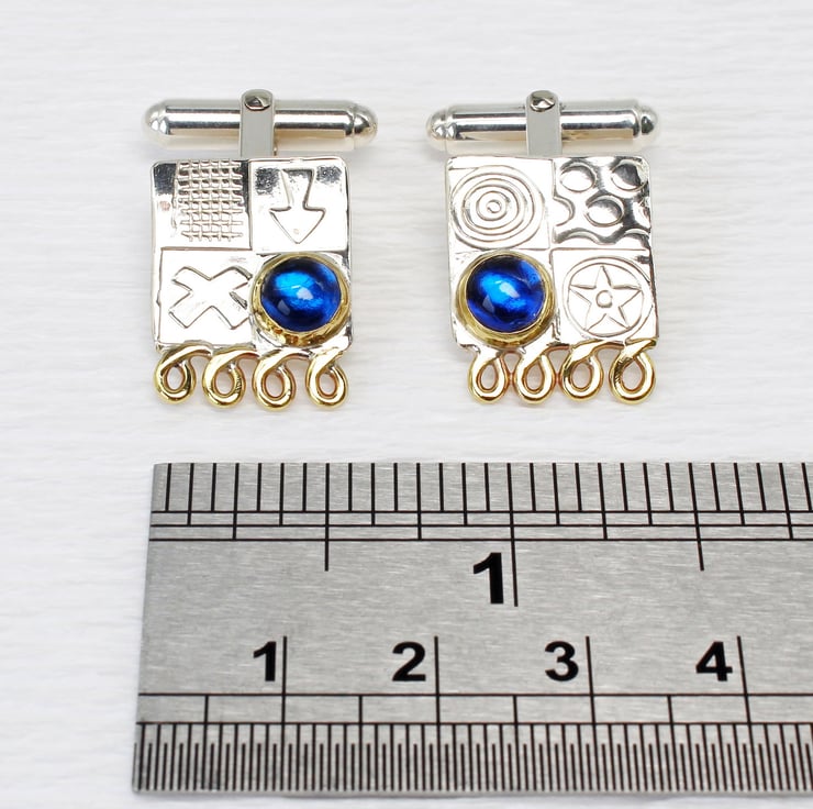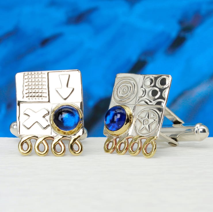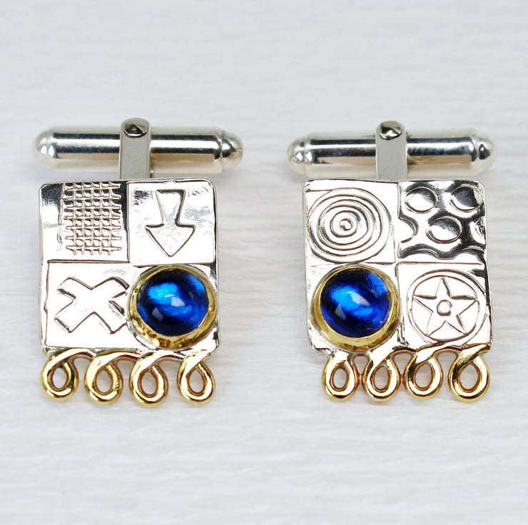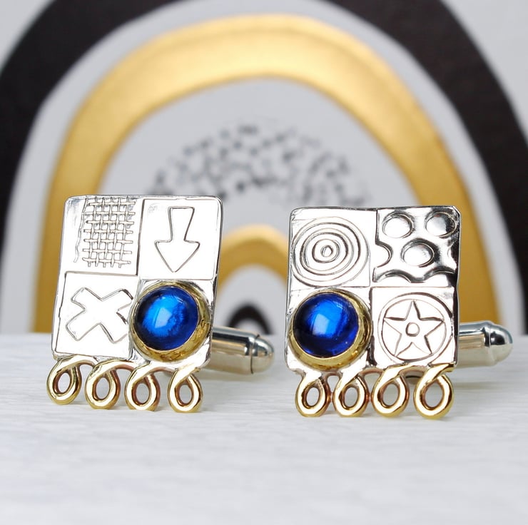 We designed and handmade these gemstone cufflinks in our workshop in Yorkshire. They are made from sterling silver, have embossed shapes and patterns and feature two of our beautiful, 6mm Blue Spinel gemstones set in brass bezels. Decorative brass hoops run along the bottom of the cufflinks and the quality, double-hinged backs are made from sterling silver, the cufflinks measure 15mm x 15mm. We were often asked if we could make items in our Asymmetrical range with matching gemstones and decoration so we designed our 'Matching' jewellery range.