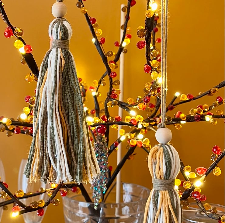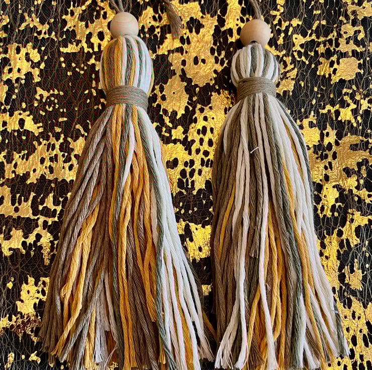 This multi-coloured tassels a re made from cotton blended yarn with a wooden bead topper. It had a simple hanger that allows you to attach or hang from most items.
