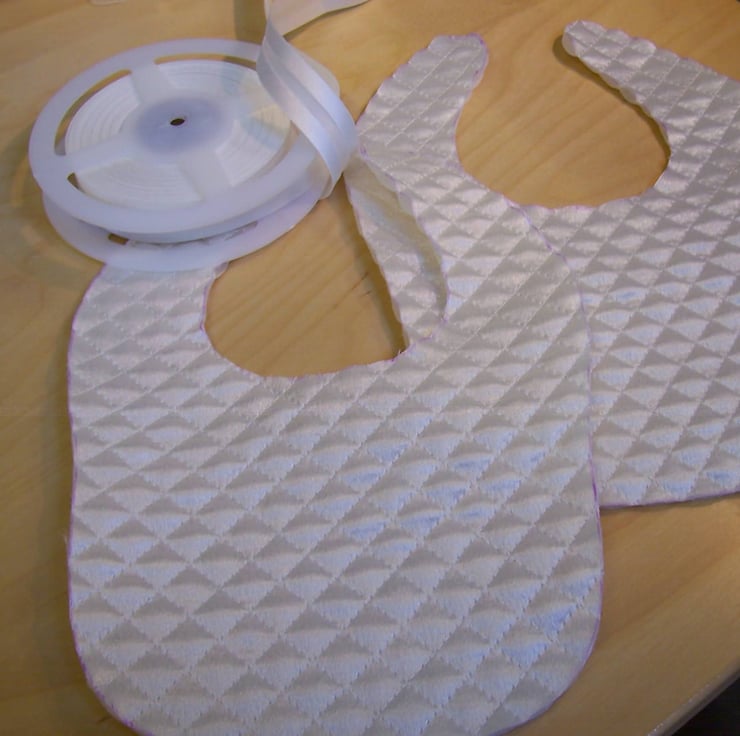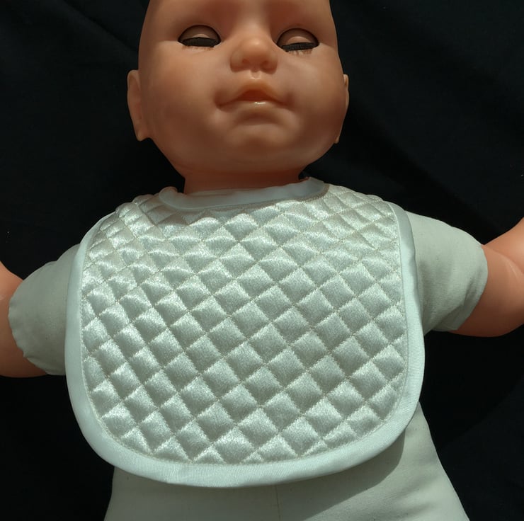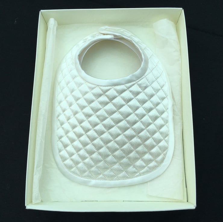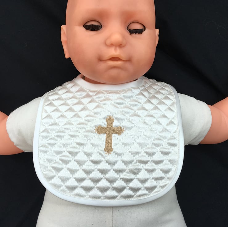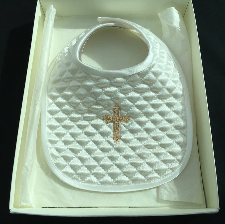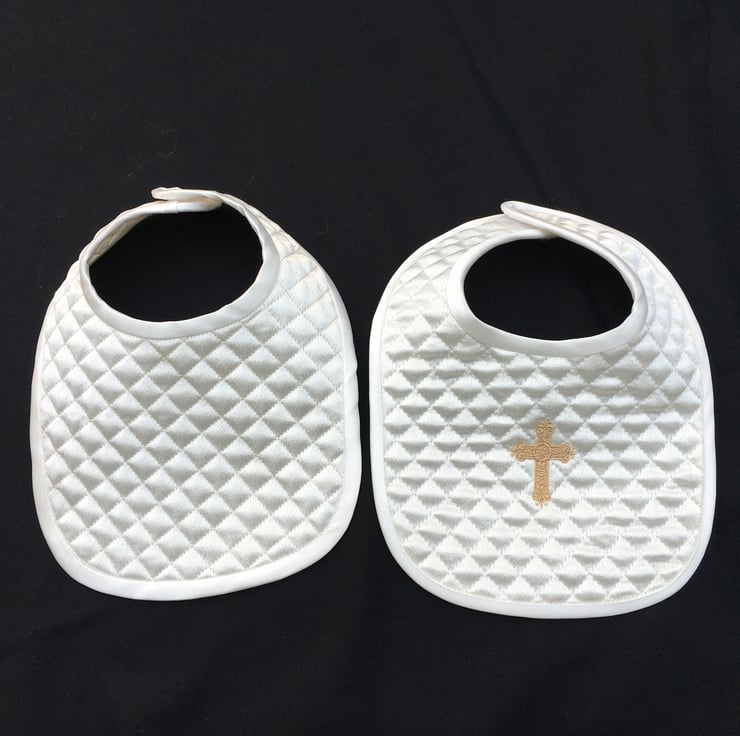 Both are Satin fabric, quilted, one embroidered with a cross, one plain, the edges bound with satin bias binding and fastened with hook and loop for easy removal. It comes in a gift box which can store the bib for when your child is 21 !