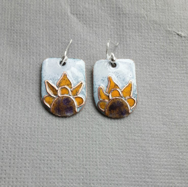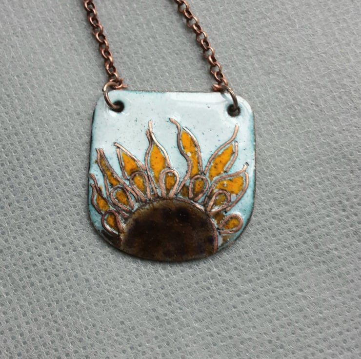 This bright and sunny necklace measures 30mm x 30mm. Made from copper, kiln-fired enamels and copper wirework, the chain measures approx. 18 ins. Lovely statement piece which woiuld look stunning against a black or dark outfit. I have also made matching earrings.