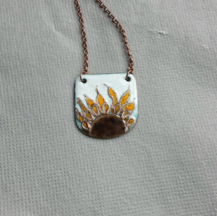 These sunny earrings measure approx. 20mm x 25mm. They depict sunflowers and are crafted on copper, enamelled and outlined in copper wire. The earring hooks are made from sterling silver and arrive in a box. There is also a matching necklace.