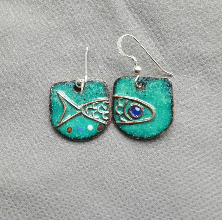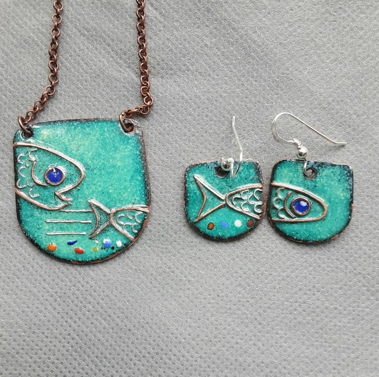 These lovely earrings measure approx. 20mm x 25mm. They are crafted from copper, which I have kiln-fired with sea green enamels, copper wire-work to depict half a fish on each earring! I've finished them off with sterling silver hooks and they arrive in a box. Quirky or what! There is also a matching necklace.