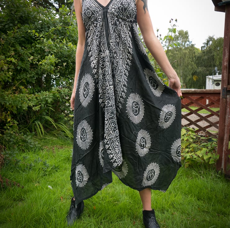 These Cotton Dresses come in Black Purple Green Blue and Yellow and come with different prints Om Shiva and Ganesha depending on the material available ( let me know if there is a specific print you would like and I will try to accommodate ). They all vary slightly but have the same hippie vagabond style just let me know which colours you would like when you order. .