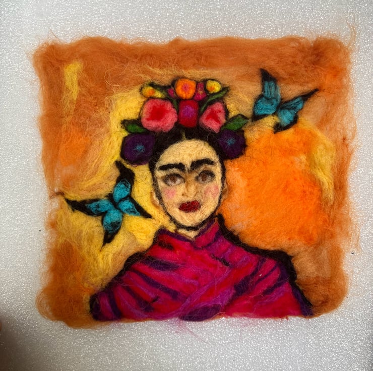 Handmade needlefelt portrait of Frida Kahlo in a maximalist style. A5 size. Unframed.