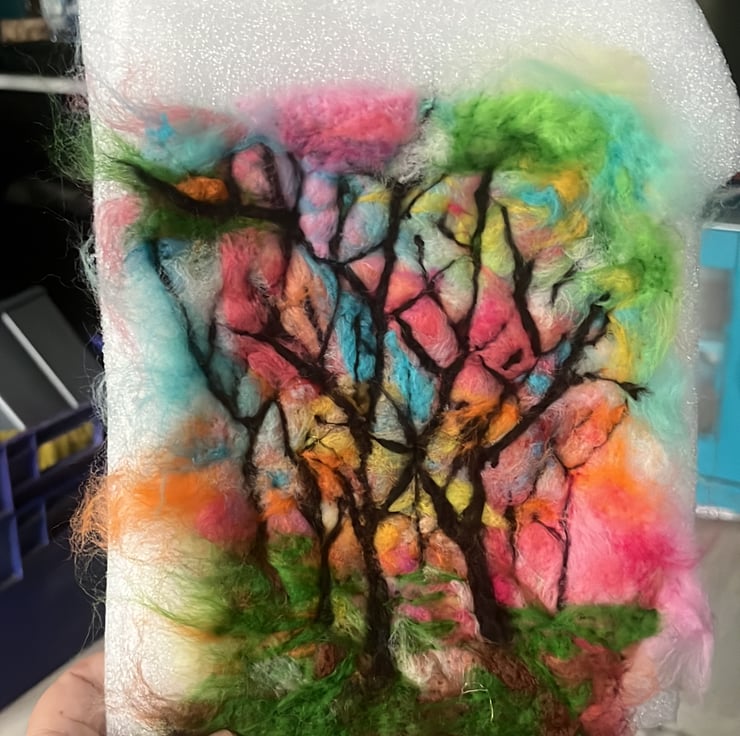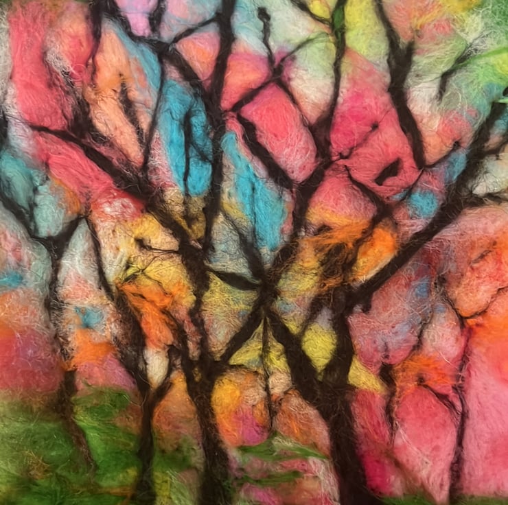 Handmade, wool needle felt of Colourful abstract landscape A4 size Silhouette trees against a multicoloured sky