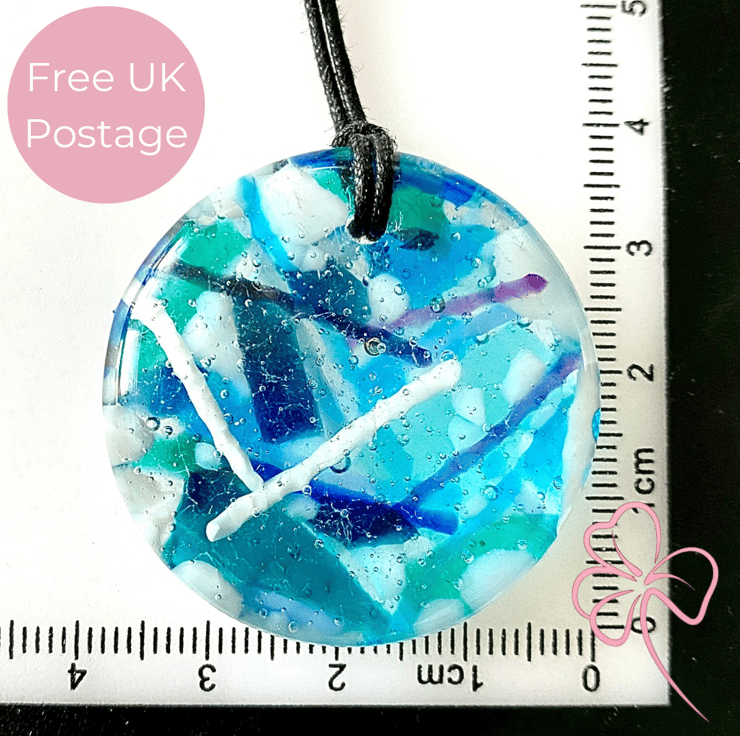 This glass pendant was made by fusing multiple pieces of glass in different shades of blues and white, together with hand crushed clear glass in a mould. It was fired at 800 degrees Celsius in a specialist glass kiln and gently cooled over a 12 hour period. It measures approximately 3.9cm across.