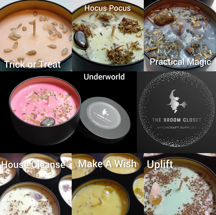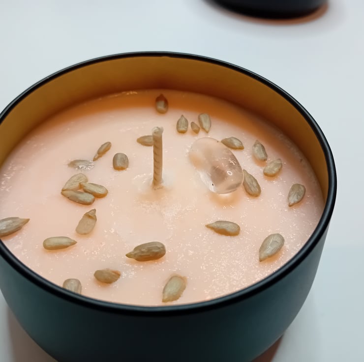 A sweet scented fragrance for any fan of all things witchy. Presented in a black tin with sunflower seeds and clear quartz. There is approx 175g of wax in each candle. Each is hand poured.