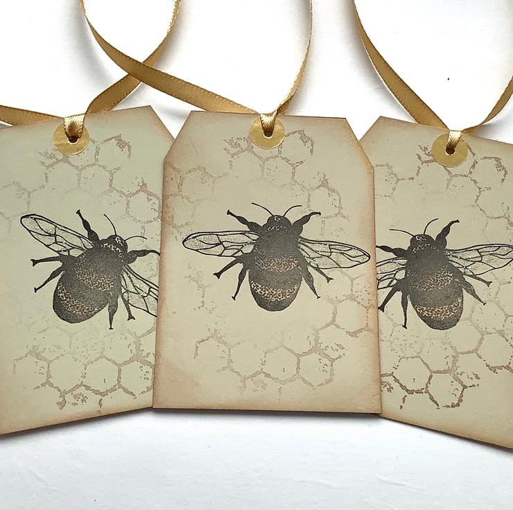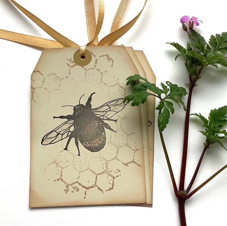 You will receive three tags as pictured ( each bee positioned slighty differently ) . Need some wording / sentiment or a larger quantity ? please don't hesitate to get in touch .