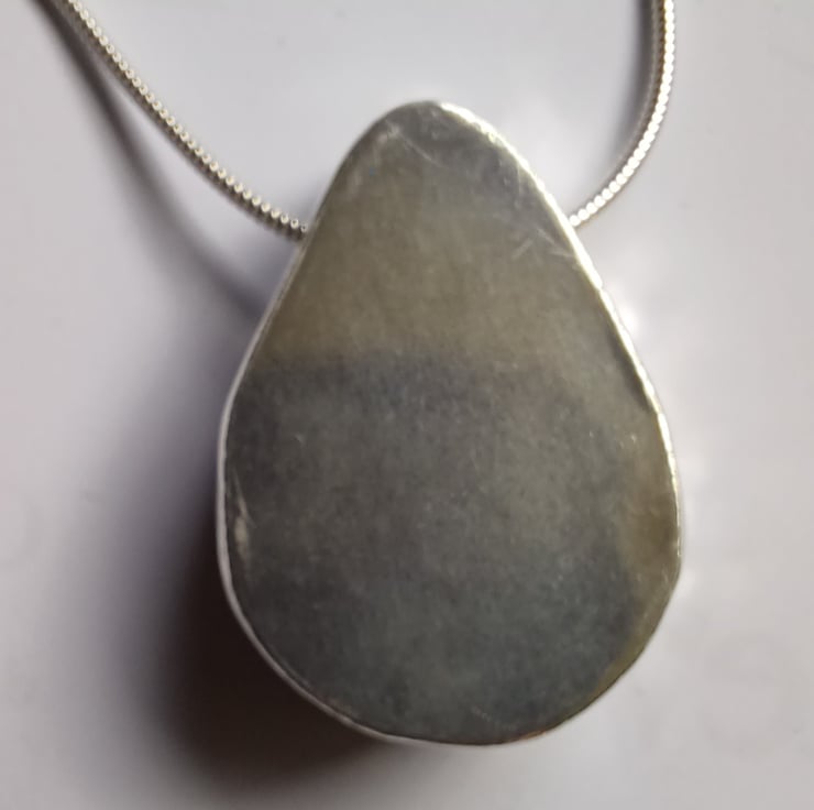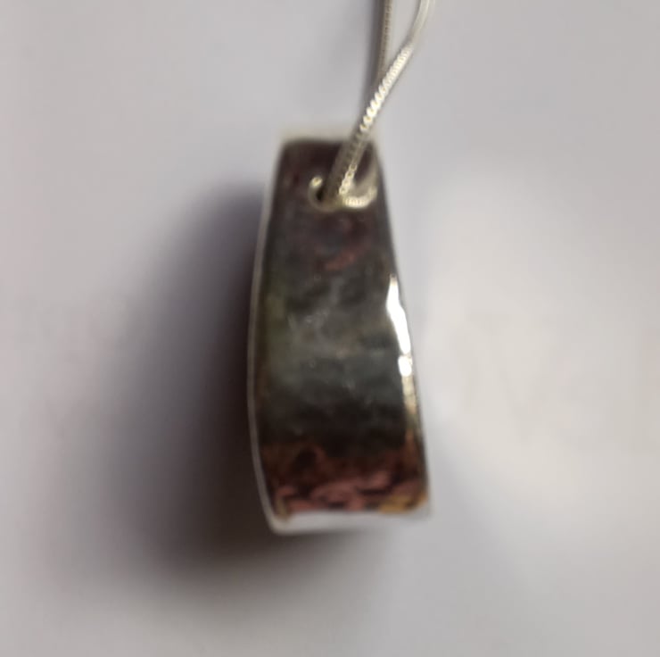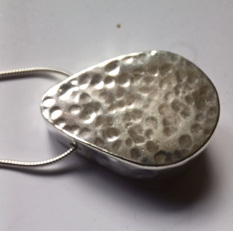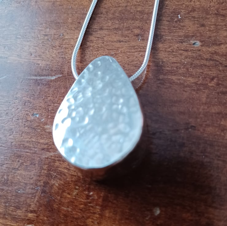 An elegant box (3D) teardrop in sterling silver hangs from an 46cm (18") snake chain, which is fastened by a small lobster clasp. The teardrop is 3cm long, 2cm broad at its widest part, and 0.5 to 1cm deep. The teardrop has been beaten to add texture to the front and sides.