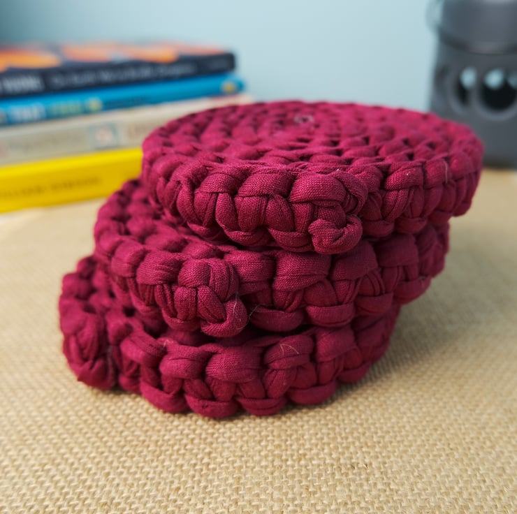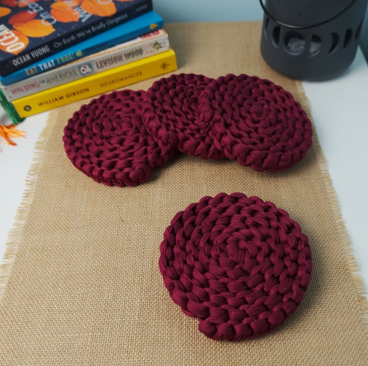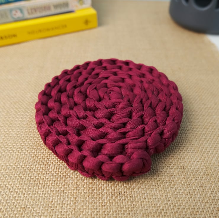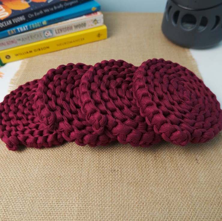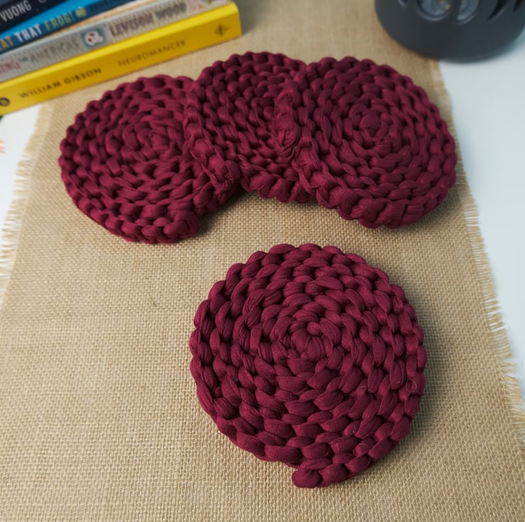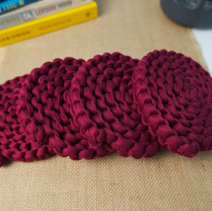 Each coaster has been handcrafted using macramé t-shirt cotton and comes in a gorgeous deep red colour.