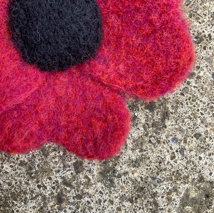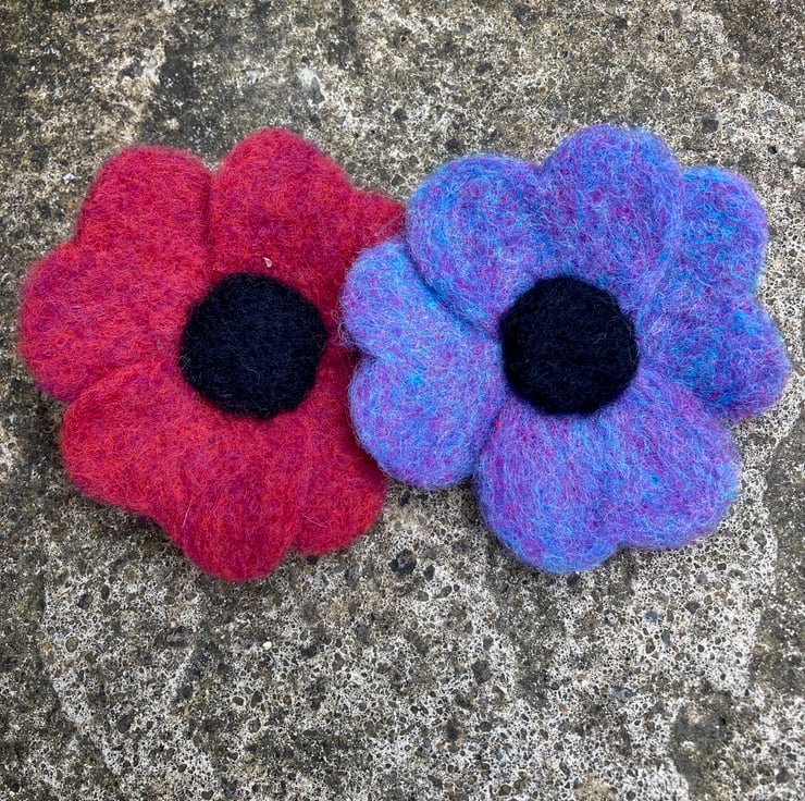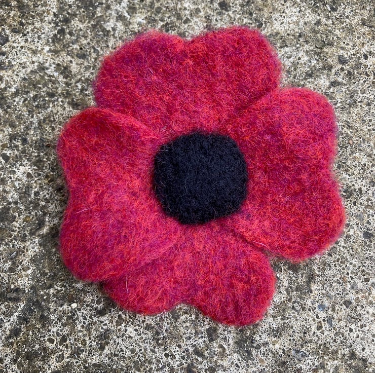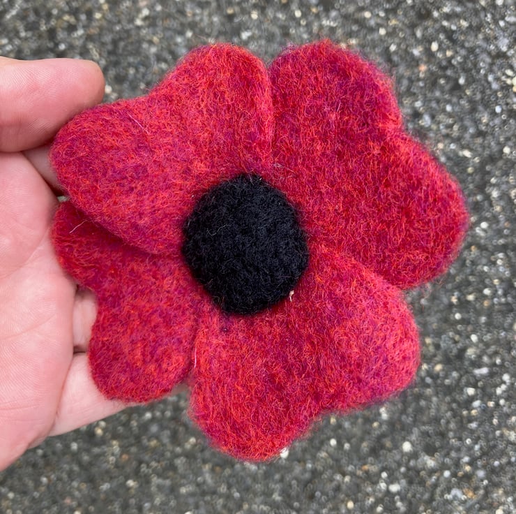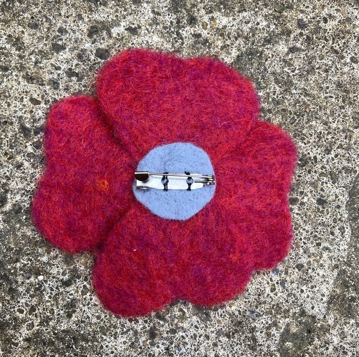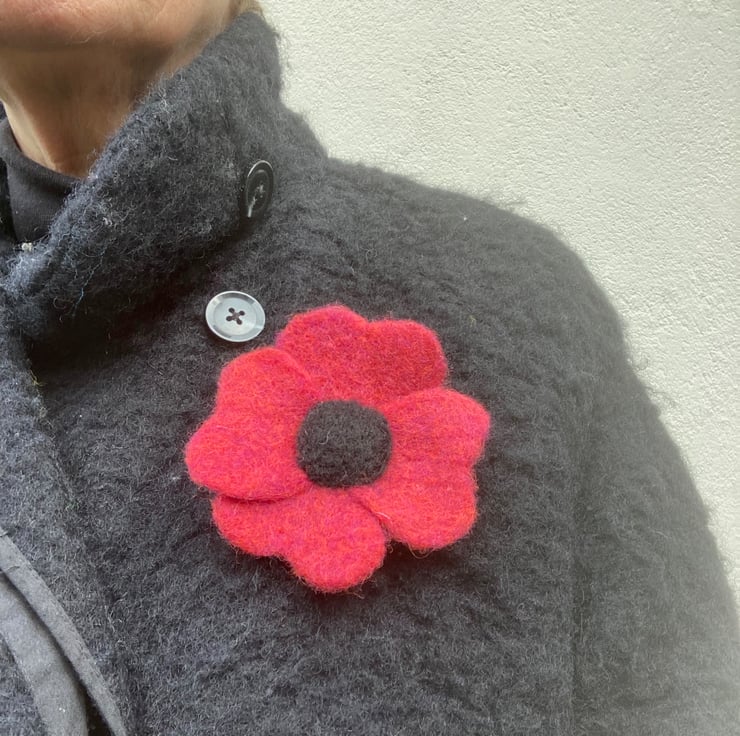 This fabulous, striking flower brooch has been hand felted from a blend of red and orange Corriedale woollen fibres with a black centre. All parts of the flower have been made and assembled using a needle felting technique. The woollen fibres are bound together and shaped by the barbed felting needle. The red flower has 4 heart shaped petals and a black centre resembling a poppy. It has a silver tone brooch pin secured to the reverse allowing it to be fastened as a brooch to brighten up any outfit.