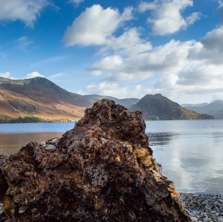 A stunning piece of Lake District photography, featuring a landscape shot taken on the shores of Crummock Water in the English Lake District, looking down the lake towards Buttermere with a large piece of driftwood from the recent storms in the foreground.