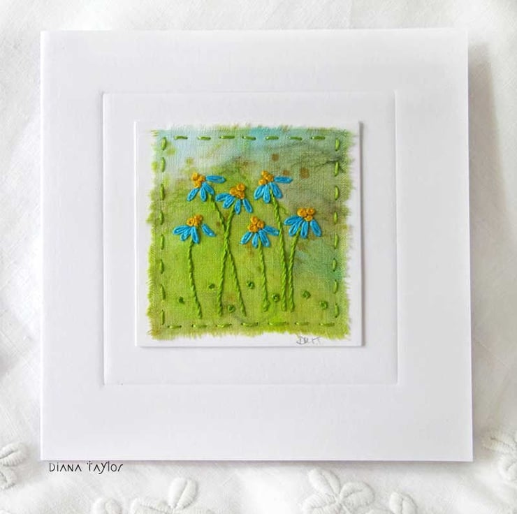This beautiful card has been embroidered by hand onto fabric that I have dyed in shades of green, brown and aqua. The embroidery design is of daisy style flowers in a rich blue - perfect for a special occasion, or perhaps framing it as it is. It has been mounted on a card base and is surrounded by an embossed square. The card has been left blank for your own message.