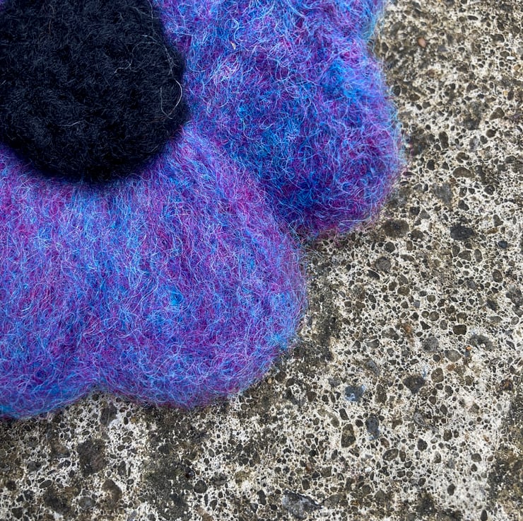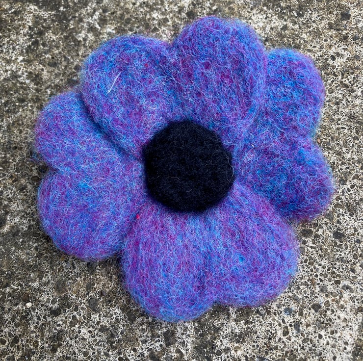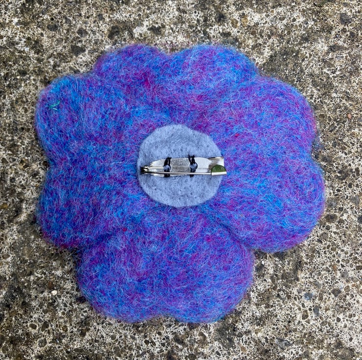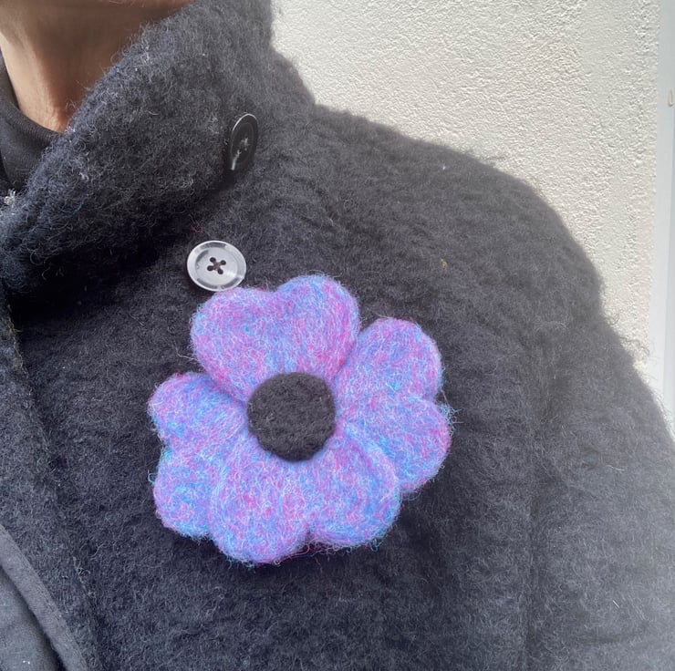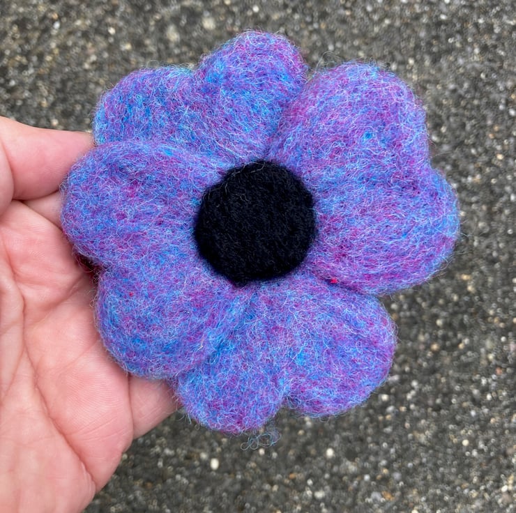 A striking flower brooch guaranteed to brighten any outfit. This large flower brooch has been needle felted using a blend of light purple and blue Corriedale woollen fibres with a black centre. Four heart shaped petals have been needle felted and assembled together and the black centre added. A silver tone brooch pin has been attached to the reverse. The flower measures approximately 9cm in diameter.