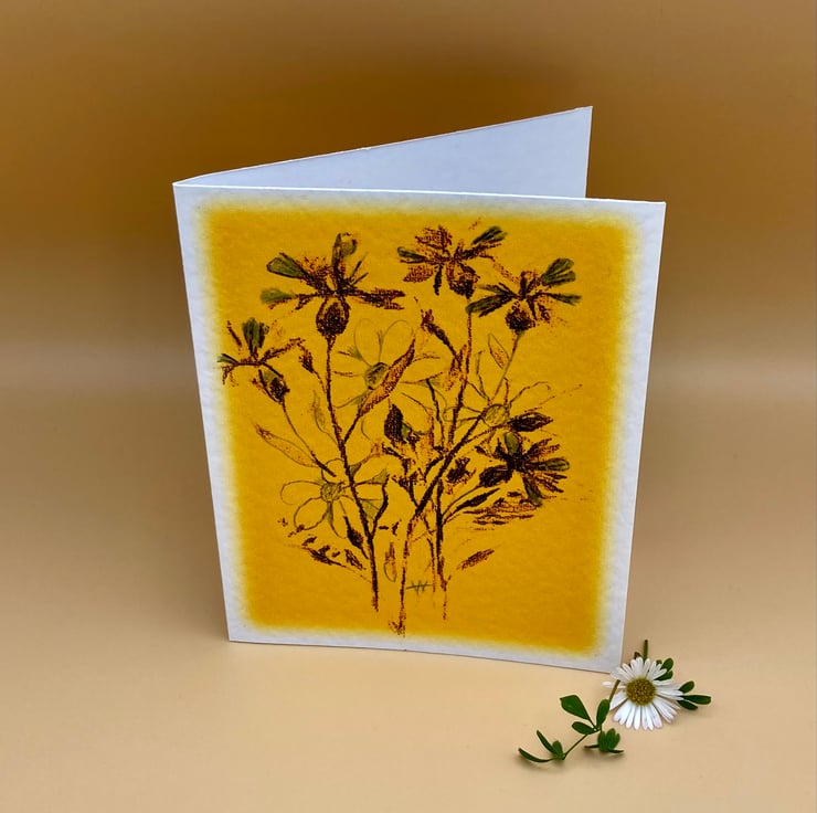 This card shows an outline sketch in dark ochre of wild flowers in a stylized bouquet all set against a vibrant buttercup yellow background. Taken from one of my originals the little card is a charming way to send your own message. The image has been slightly manipulated to enhance the look of the pencil sketch and is printed on textured 300 gm quality card.