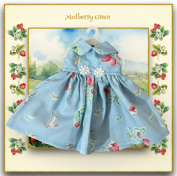 A pretty little pale blue dress in a bunnies and strawberries print, to fit the Mulberry Green characters. The dress is made from best quality cotton and has a Peter Pan collar and a lined bodice.