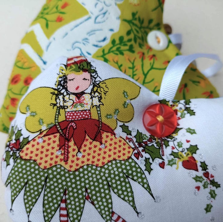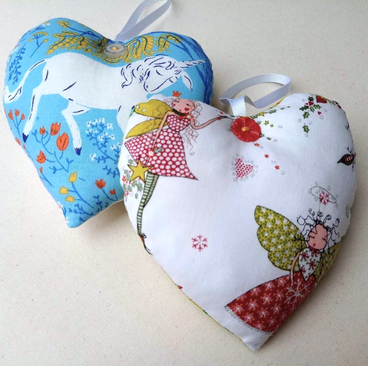 There are a few styles of fairies (see the photos) that will be chosen at random, and the placement of the fairies and unicorns will be different from heart to heart. Button colours will also vary but will complement the prints.