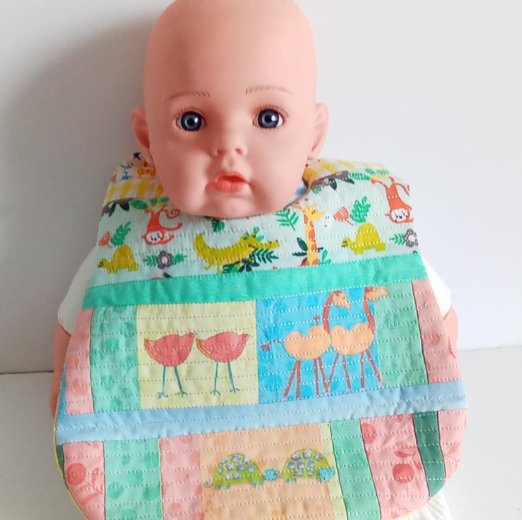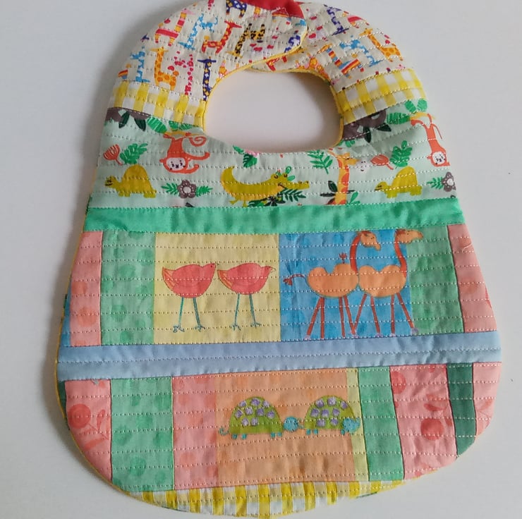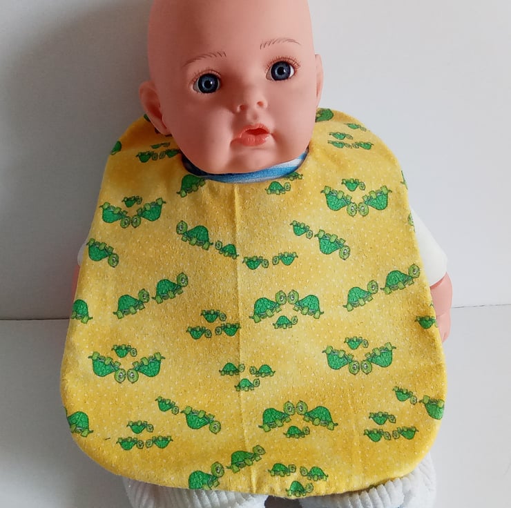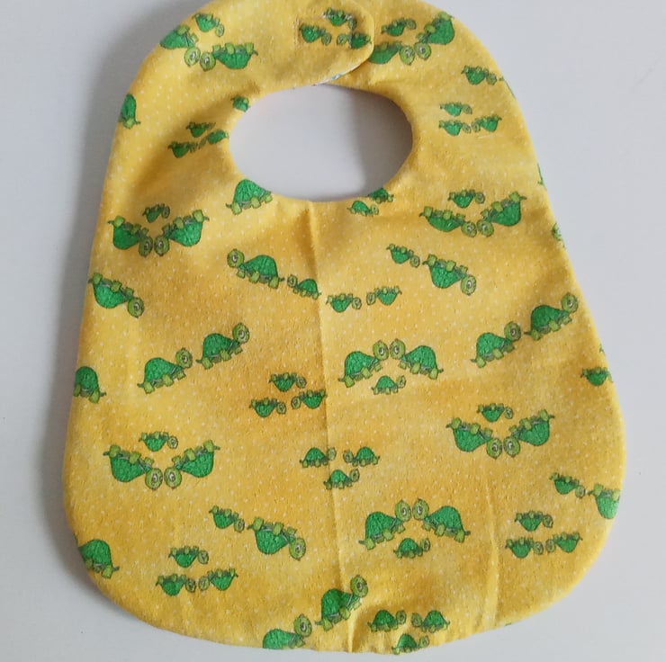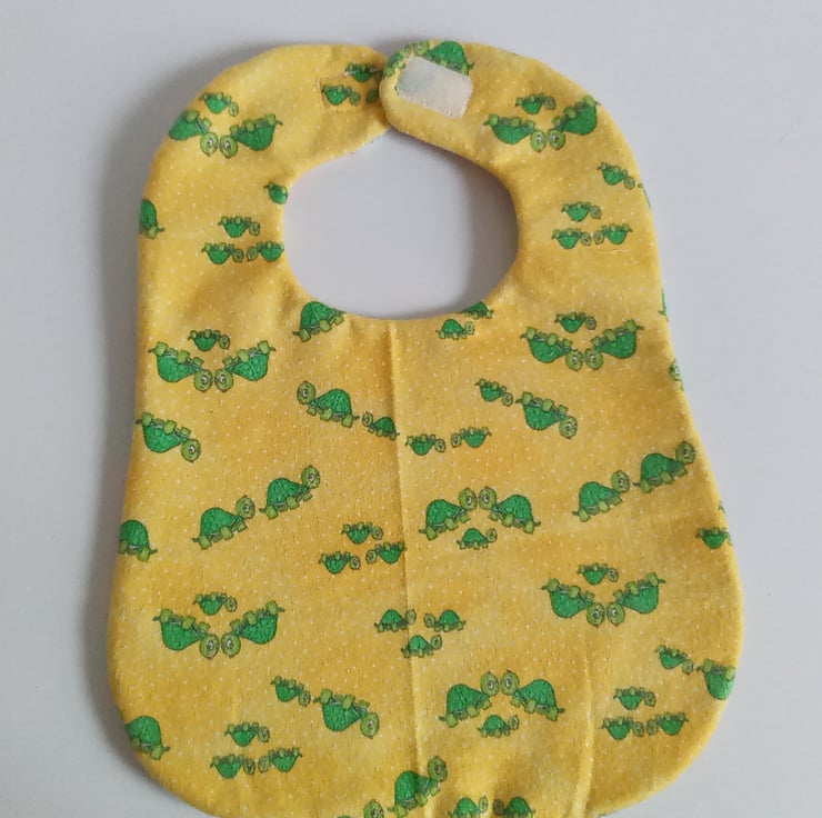 A babies bib suitable for over 3 months with a Velcro fastening to make neck size adjustable.