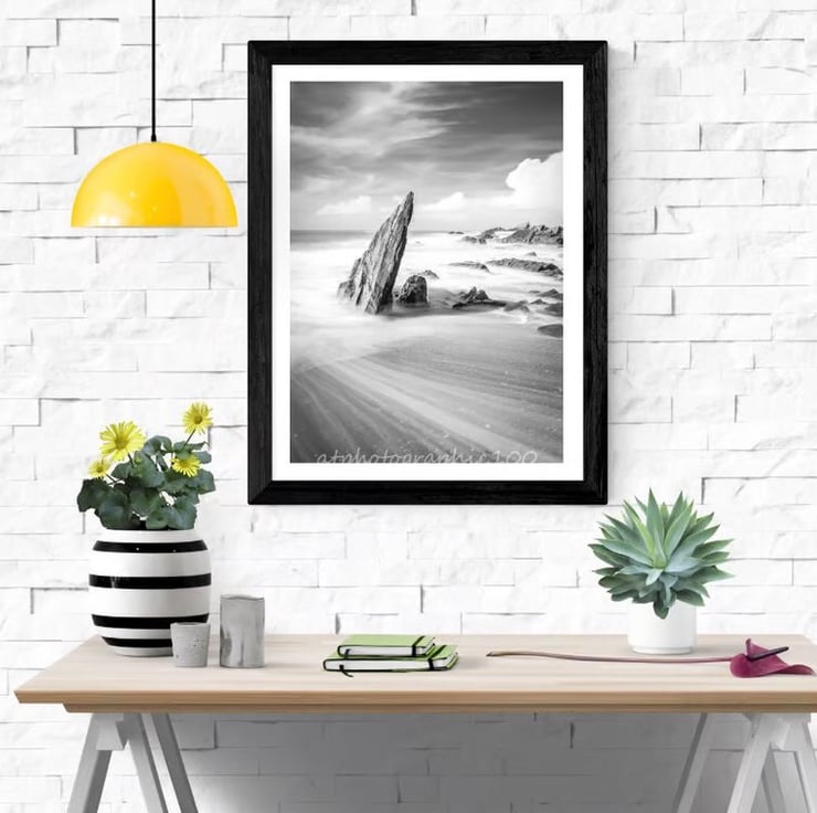 This rock is situated at one end of the beach at Ayrmer Cove in Devon. It stands about 8 feet high and is almost fully submerged at high tide. I followed the tide out and took some black & white, long exposure photos which make for an interesting image with the white streaks of the water flowing back out to sea as the wave recedes.