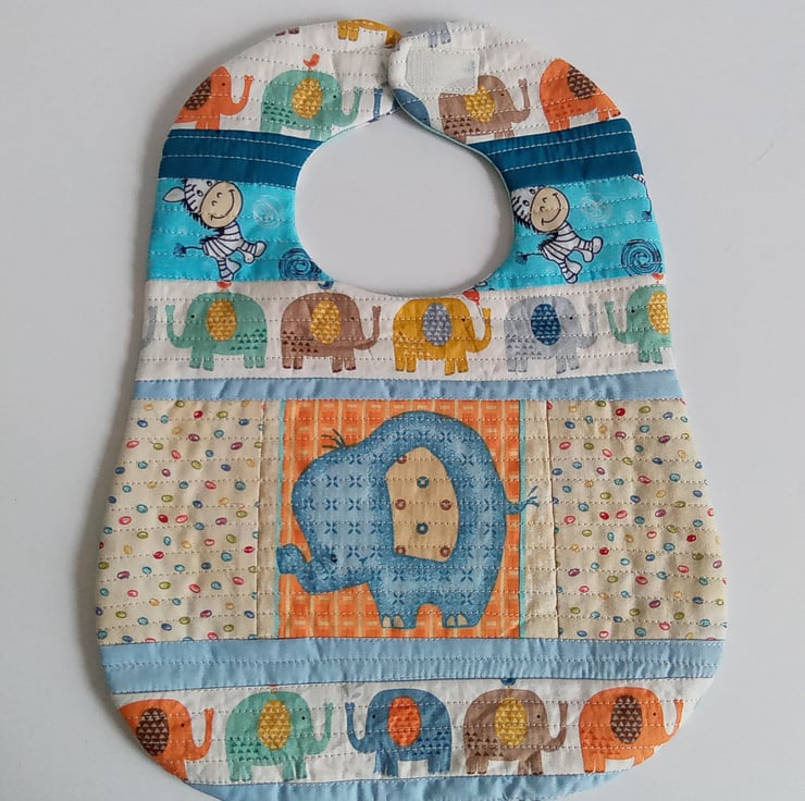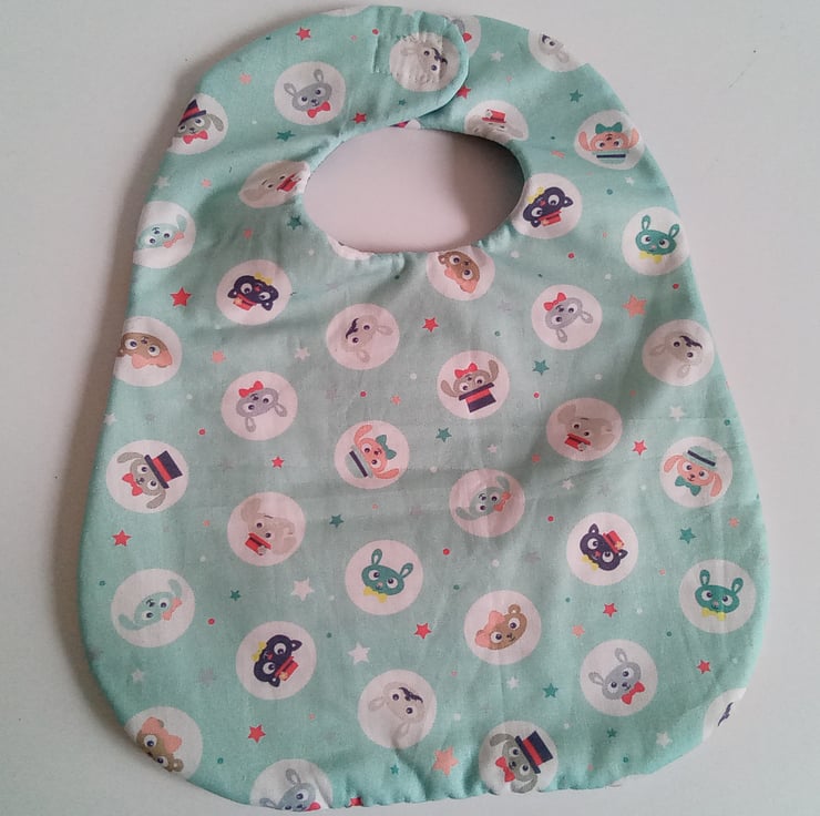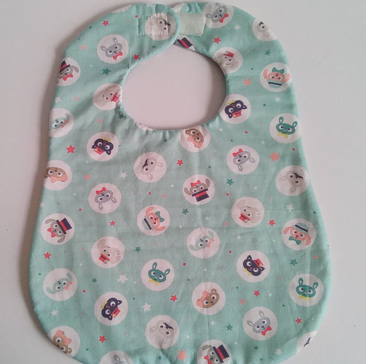 A babies bib suitable for over 3 months with a Velcro fastening to make neck size adjustable.