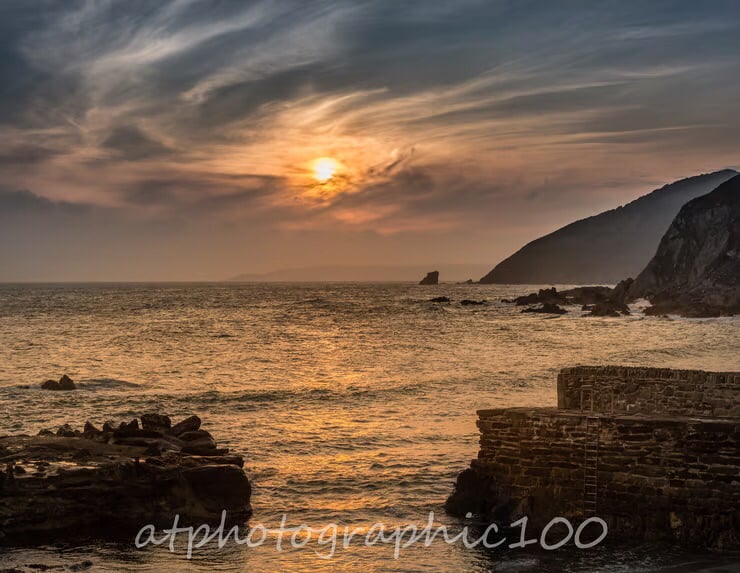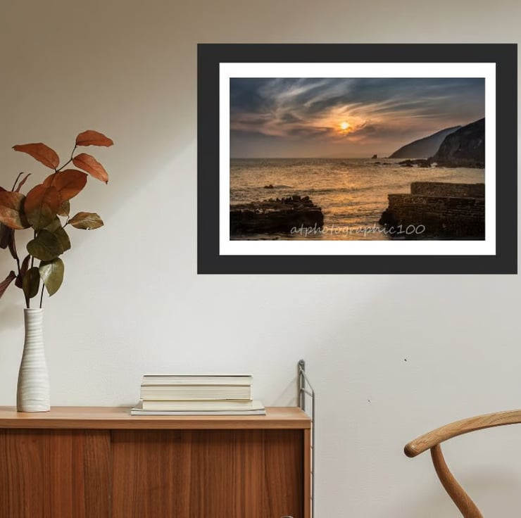 Photographic fine art print taken from the harbour wall at Portwrinkle in Cornwall, where I had been taking photos along the beach and was working my way towards the harbour at the end of the day. The skies had been clear all day but this bank of cloud rolled in to obscure the sun and while I hadn’t been expecting any colour at sunset, I decided to wait. Just as I was making my way back to the car, cloud and sun cam together and gave this lovely effect.
