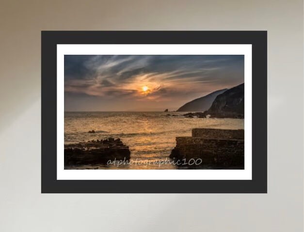 Photographic fine art print taken from the harbour wall at Portwrinkle in Cornwall, where I had been taking photos along the beach and was working my way towards the harbour at the end of the day. The skies had been clear all day but this bank of cloud rolled in to obscure the sun and while I hadn’t been expecting any colour at sunset, I decided to wait. Just as I was making my way back to the car, cloud and sun cam together and gave this lovely effect.