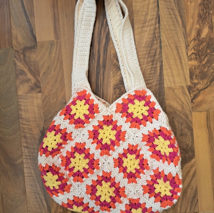 Made from 100% cotton yarn and I have lined the bag, so you don't lose any small items and I have also lined the straps to stop them from stretching.
