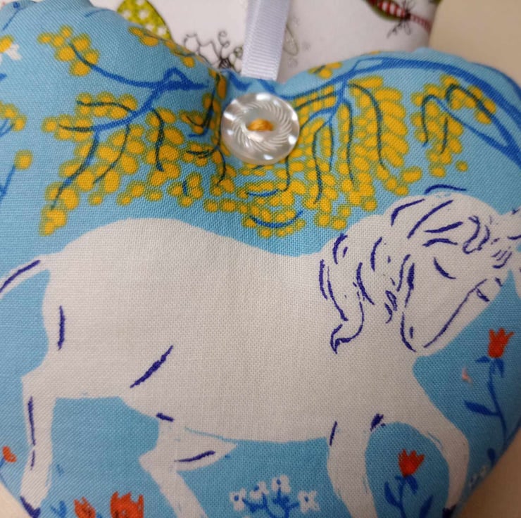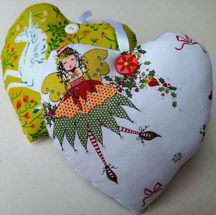 There are a few styles of fairies (see the photos) that will be chosen at random, and the placement of the fairies and unicorns will be different from heart to heart. Button colours will also vary but will complement the prints.