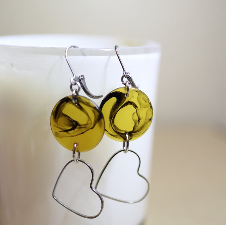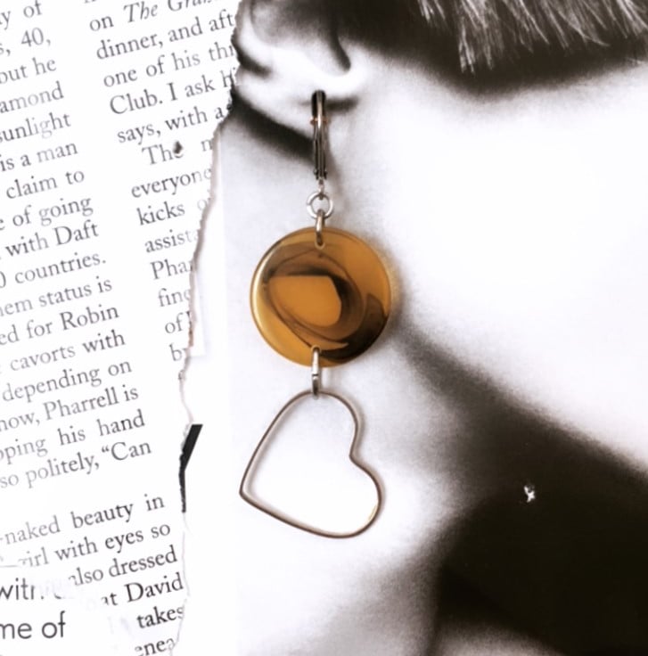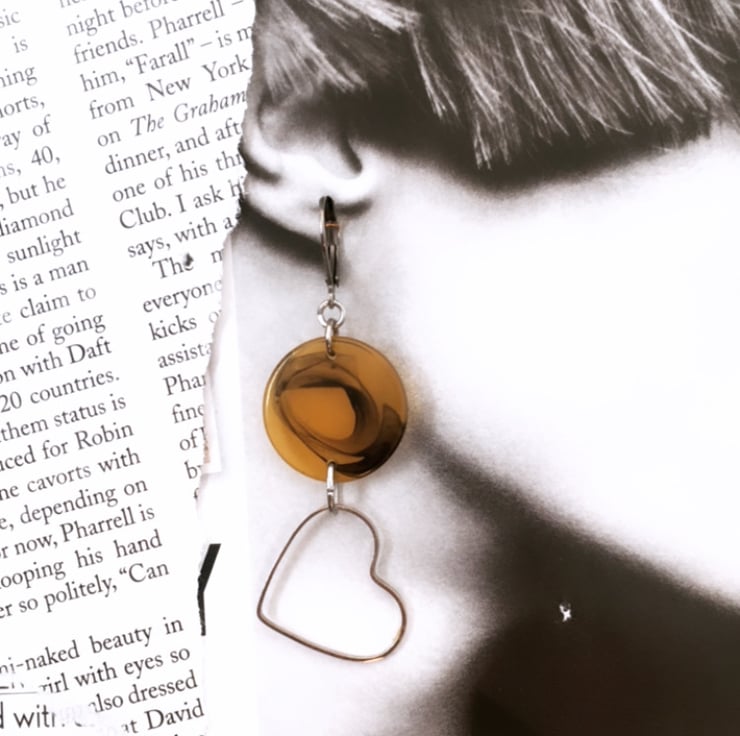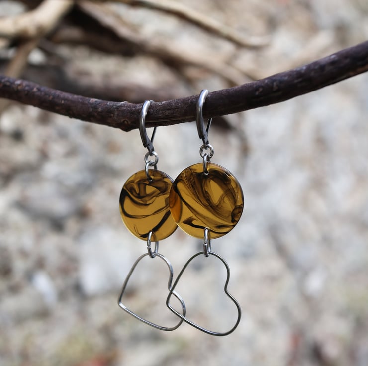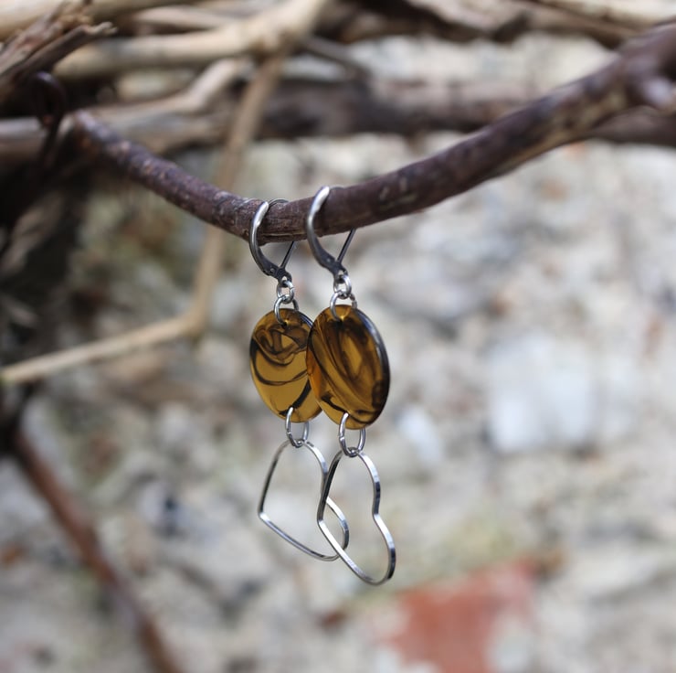 Up-cycled Faux tortoise shell look connector disc - dangle with wire heart earrings