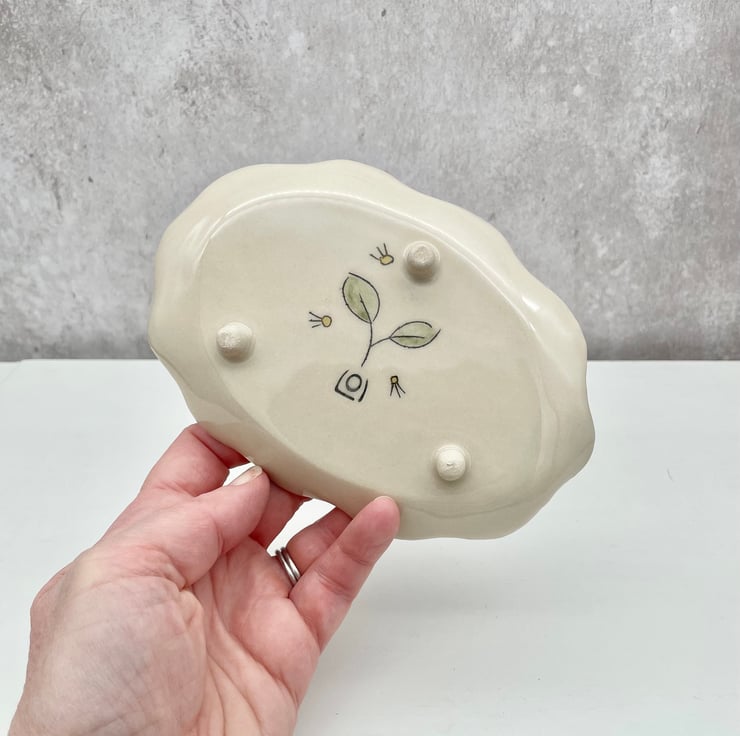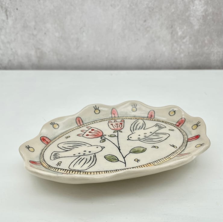 It can be used as a jewellery dish or a soap dish, adding a pretty touch of whimsy to your table top. It’s an oval, footed dish, standing on 3 legs with a wavy edge. The hand carved and painted design incorporates flowers and flying birds with blue, green, pink & yellow. Being handmade, each dish I make differs slightly, none are ever identical.