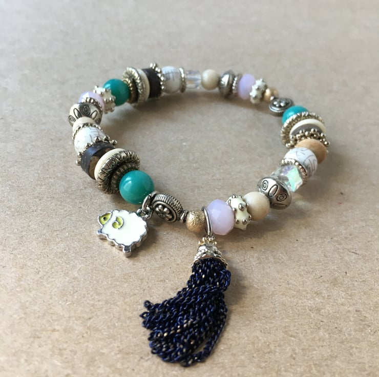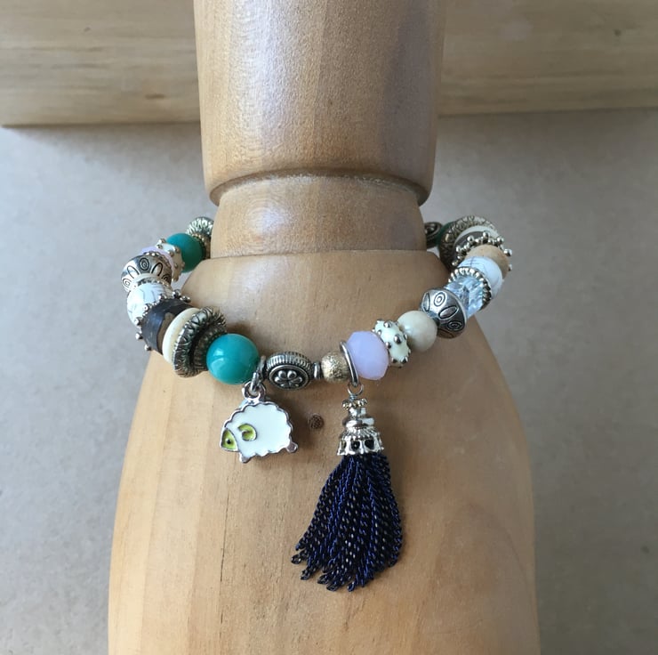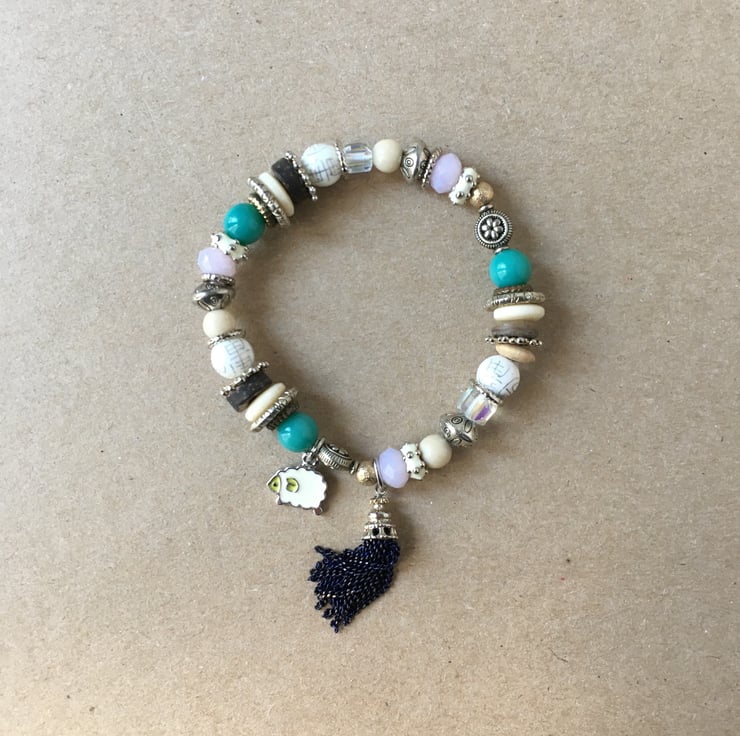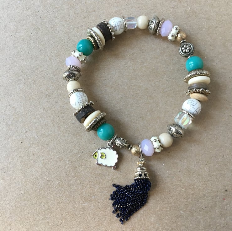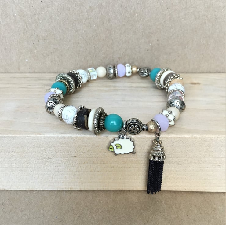 Beautiful lot of lilac and turquoise colour beads beaded with tiny sheep charm upcycled elasticated handmade bracelet - costume jewellery
