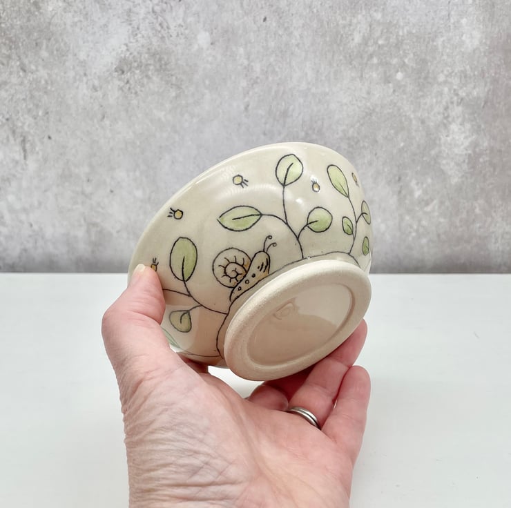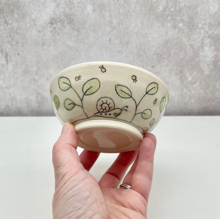 I throw these cute little dishes on the wheel in stoneware clay. They’re a durable, versatile and unique keepsake item, along with being a practical item. The hand carved and painted design incorporates a central flower with leaves and seed heads in happy shades of pink, orange & green. There’s also a snail hiding amongst the leaves. Being handmade, each dish I make differs slightly, none are ever identical.