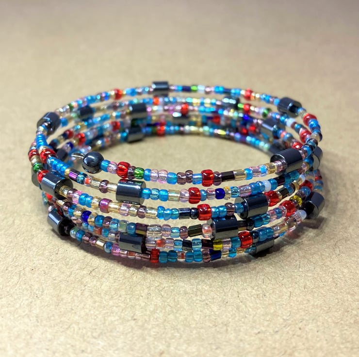 Trendy Multicolor Seed Beads - Hematite Semi Precious Stone Tube Beads - Memory Wire Adjustable Bracelet - memory wire bangle steel bangle - upcycled - handmade - gifts - healing