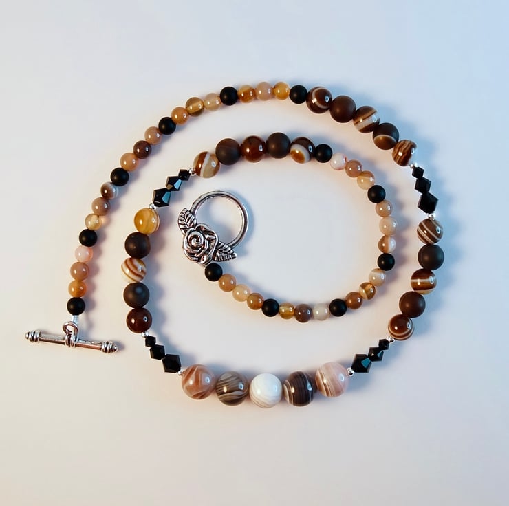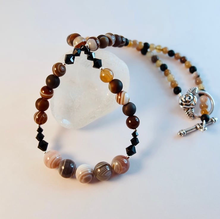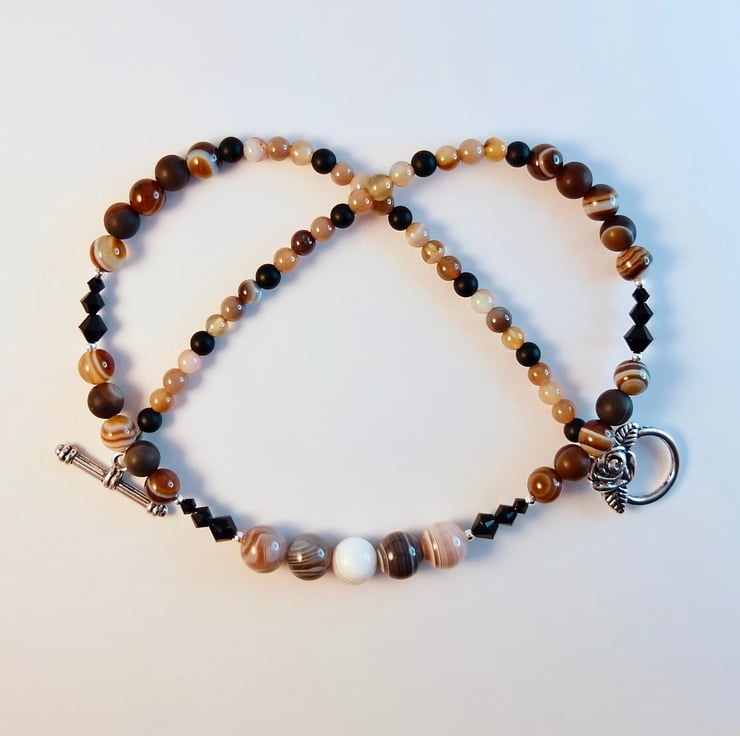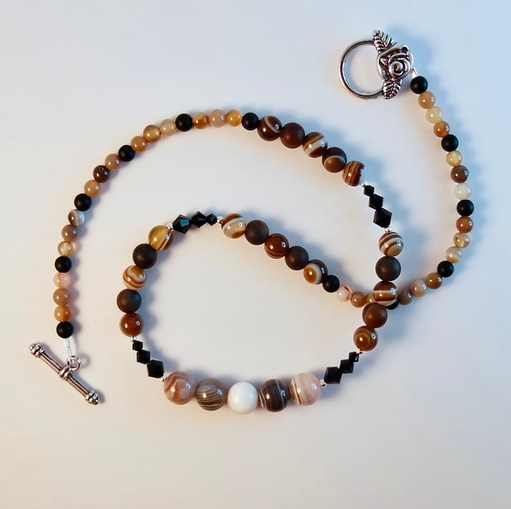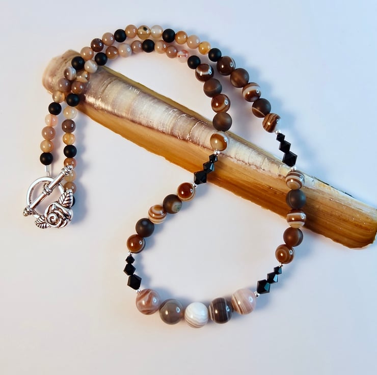 The necklace continues with 6mm brown Agate and another trio of crystals on each side, then graduates to 4mm Agate with a scattering of frosted black Onyx.
