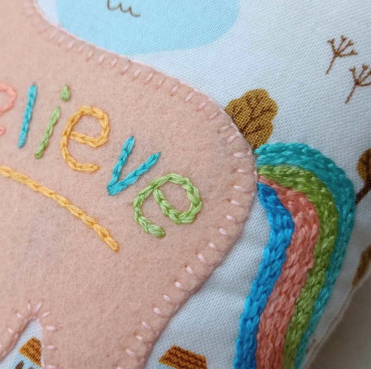I hand drew and cut the unicorn from 100% wool felt in pretty peach, and hand embroidered it to the castle themed background fabric, using a small blanket stitch. The main and tail are rows of chain stitch in lovely soft pastel shades, and his horn is satin stitch in golden yellow.