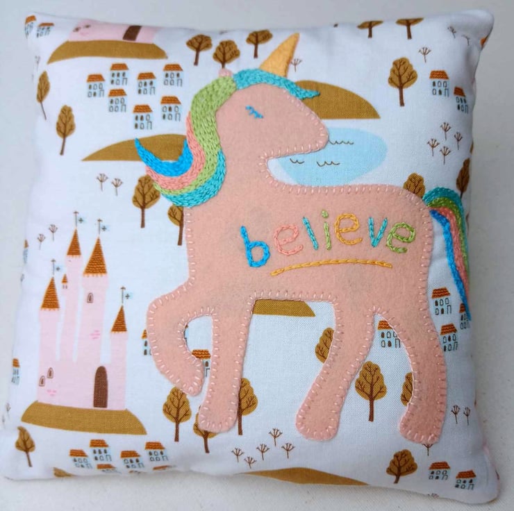 A cute felt unicorn in gender neutral shades, hand embroidered against a castle backdrop - my mini-cushion would be a lovely gift for anyone who believes in magical creatures.